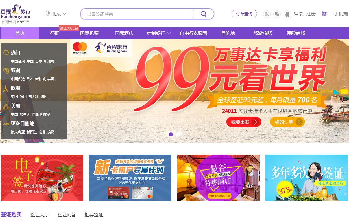 北京百程国际旅游股份有限公司(服务品牌“百程旅行网” www.baicheng.com,股票简称:百程旅游,股票代码:836925),是经国家旅游局,北京市工商行政管理局批准设立的,具有独立法人资格的股份制企业,注册资本2526.8969万元,拥有中国公民出境旅行业务特许经营许可(许可证号:L-BJ-CJ00223),及电信与信息服务业务经营许可(许可证号:京ICP证150744)。公司主要经营出境旅行在线零售、商务旅行服务,总部设立在北京,并在上海、广州、深圳、成都、沈阳、武汉设立六个分公司。公司是北京市旅游行业协会副会长单位、中国航空运输协会会员单位,2013年8月被北京市旅行社等级评定委员会评定为“5A级旅行社”。作为中国出境自由行细分市场领先的O2O运营商之一,百程坚持以时代用户的需求为核心,以服务为导向,利用互联网技术与前端渠道、平台拥抱,在商品、服务、数据上进行对接从而获得精准消费用户。百程将行业专业知识与新技术相结合,优化服务操作流程和互联网产品创新,自主研发了“签证服务大厅”产品,为用户实现了“资料对照”、“远程预审”、“进度时报”的服务功能,“目的地服务大厅”为自由行、碎片式消费人群实现了接机、门票、日游的专项服务。其中的“签证服务大厅”、“签证工业化”、“海外字典库”、“购物神器”、移动APP“签证官软件”获得了中国版权保护中心的计算机软件著作权。百程专注“中国公民出境旅行”,以“签证为跑道”,延展出目的地(接机、门票、日游)服务、自由行套餐服务、国际机票和国际酒店服务和以家庭、社会群体为主体的出国定制旅行服务。从2011年为2万人次出国提供服务,到2015年已累计为近200万人次提供服务,得到了广大用户的认可和支持。百程与各国驻华使领馆、各国旅游局、各个航空公司、境外地接社保持着良好的合作,也得到了各大电商平台、旅游同业等合作伙伴的认可和支持。百程先后荣获比利时法兰德斯旅游局颁发的“2015年最佳OTA合作伙伴”大奖,阿里旅行“2015双十一最受消费者欢迎奖”、京东“二零一五年度金牌合作伙伴”奖,中国旅游发展峰会“2015最佳好雇主(OTA)”奖,荣膺“博雅中国百强服务品牌”。百程的管理团队在出境游行业的平均服务超过十五年,在旅游行业及资本运作均有丰富经验,对旅游行业的发展有着深刻理解和独到判断。他们的身边是一群充盈朝气、满怀斗志的80后、90后年轻员工,他们共同组建了在线旅游业的一支新锐战斗团队。百程以“成为全球华人最信赖的海外旅行服务品牌”为愿景,以“让海外旅行更加自在随心”为使命,以“共赢”为发展的核心价值观,坚持以人为本的人才管理理念,给想做“事”的人机会,给会做“事”的人舞台,给做出“事”的人激励和更广阔的发展平台,让先进的企业文化在每一个百程人身上传承。