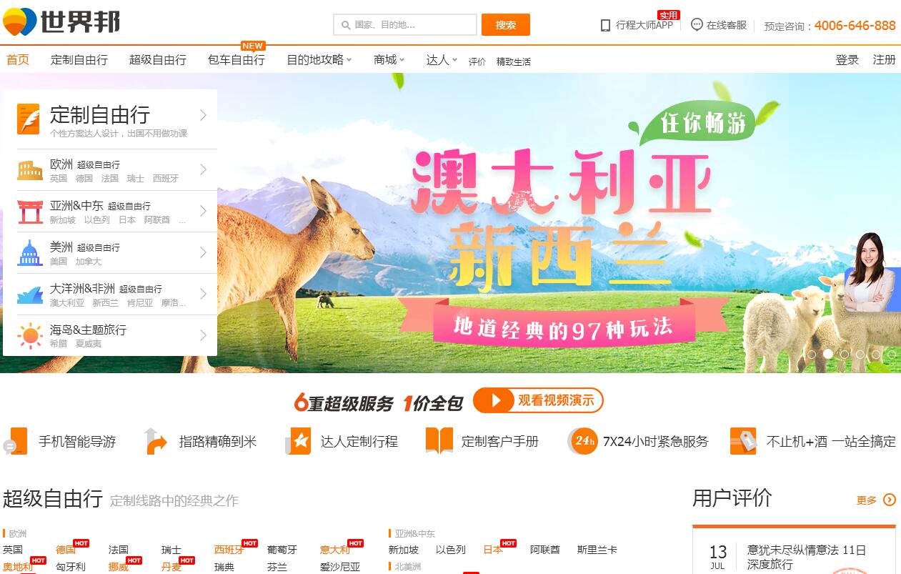 世界邦旅行网(www.shijiebang.com) 多年专注于出国自由行市场,秉承“安享·智能·自由行”的愿景,基于移动互联网和人工智能技术,为向往自由行的用户提供高性价比、高品质的出国自由行产品及个性化的智能旅行服务,目前是国内具有旗舰规模的出国自由行服务龙头企业。成立以来,获得杨致远等著名天使投资人和新浪集团、复星集团等机构的战略投资。世界邦旅游集团旗下包括:世界邦旅行网www.shijiebang.com, 走遍世界国际旅行社(北京)有限公司,世界邦国际旅行社(北京)有限公司;以及走遍世界(北京)信息技术公司和世界邦(北京)信息技术公司。世界邦汇聚全球1,000多名旅行达人,公司活跃用户超过一千万,“行程大师”等手机客户端激活用户超过600万;旅游服务及资源覆盖欧洲、美洲、大洋洲、亚洲、非洲等地区的六十多个国家、数千个城市。世界邦旗下科技板块凭借其雄厚的技术实力,被国家相关部门认定为“高新技术企业”,在互联网+旅游领域进行大量的科技创新与实践,在旅行产品与服务数字化领域有深厚积累,引领移动旅行服务的行业变革;旗下旅游板块不断进行产品革新,为用户提供卓越的自由行服务体验,受到中产阶层的由衷喜爱,获得业界的广泛认同;近年来,屡获《环球时报》、旅游创业高峰论坛、“一带一路”、SKIFT等机构颁发的多项业界荣誉,长期与阿里旅行、马蜂窝、中国国际航空公司等著名旅业机构保持战略合作关系。