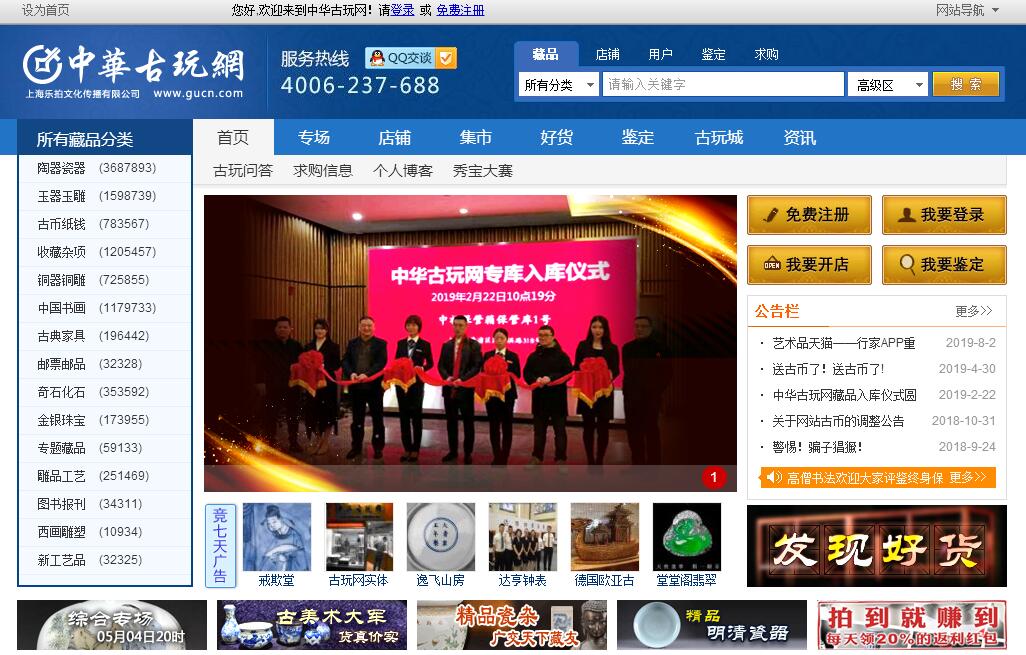 | 网站简介: 上海乐拍文化传播有限公司,是国内首家用域名进行工商注册的公司,注册资金1666万,旗下拥有电子商务网站中华古玩网(www.gucn.com)成立于2007年12月,自建立之日起一直是极具人气的古玩收藏艺术品电子商务网站,给广大古董收藏爱好者提供了一个自由交流、探讨、学习、安全便捷的交易平台,并为艺术品收藏在互联网上的发展发挥了极大作用!经过7年的发展,我们已经成为中国最好的古玩交易平台之一。涵盖古玩交易的所有种类,包含充满惊喜的地摊捡漏、严谨安全的店铺交易、简单有效的在线竞买和专场、渠道多样的委托代售。网站注册会员超过100万人、日均访问量200万,月成交额已过1500万元,现在仍在稳步高速的发展中。在这里,您会惊讶地发现原来古董收藏的爱好者有这么多,原来古董还可以这样玩;在这里,您可以找到关于收藏品的一切,并进入古董收藏爱好者的多彩世界。我们网站的宗旨是公平、公正、公信,每个会员都是我们的一份子,这就是中华古玩网! |
