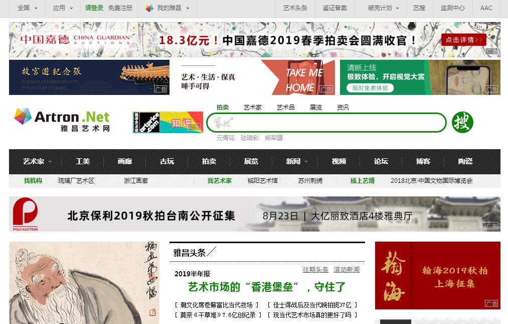 | 网站简介: 雅昌艺术网是世界知名的艺术品权威门户网站,是雅昌《艺术品数据库》的重要应用平台,涵盖字画拍卖,艺术品投资,画廊古董古玩交易信息等,是信誉服务专业收藏投资者之间的交易交流平台。 |