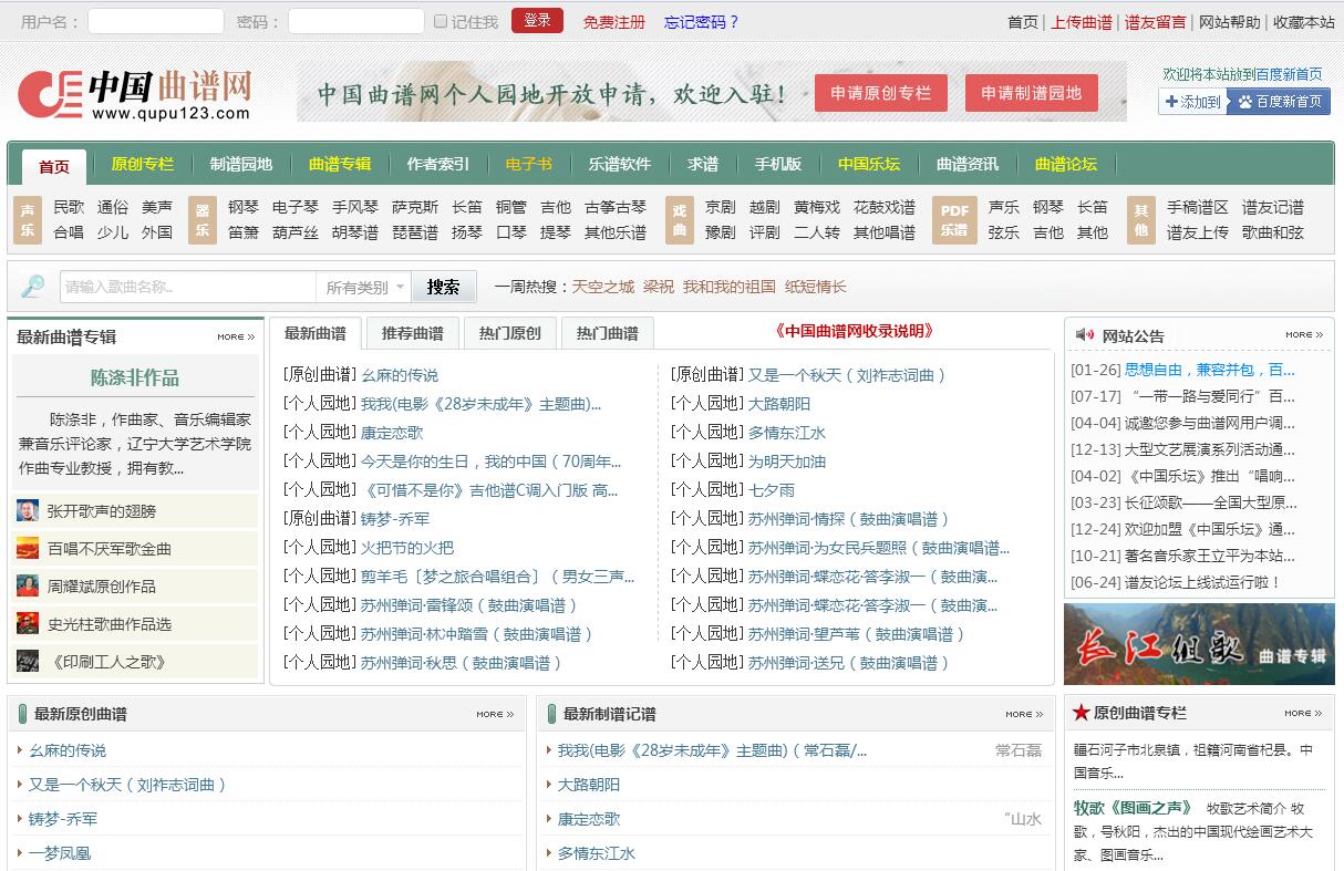 中国曲谱网(www.qupu123.com)创建于2010年4月,是由网友秋叶起舞创建的一个综合类曲谱网站。在网络上已经谱站林立之际,秋叶老师还要坚持创建和发展“中国曲谱网”,是希望尽此微薄之力扭转当时普遍存在的制谱不规范、记谱不严谨、曲谱旋律及排版错误等,极易误导音乐新人的不负责任状态。秋叶起舞此举得到了一群热爱音乐、热心为谱友服务的同道支持,先后加入风雨、桃李醉春风、宫商角徵、珠落玉盘、瓦连金娜、刘书先等诸位具有不同专业技能的老师参与网站的管理、制谱、上传和维护。7年之间,中国曲谱网走过了风风雨雨,经历了坎坎坷坷。一直秉持着免费、公益的方向,坚持着“专业、精准、规范、实用”的办站宗旨直至今日。依据网站的办站宗旨,中国曲谱网坚持以曲谱为中心,以为广大谱友奉献优良曲谱资料为己任,对自身内容方面有着很高的要求。对于用户上传的曲谱,每一首曲谱必须通过人工审查,从制谱排版到乐理常识、从旋律结构到作品内容,尽可能避免出现失误。能修正的则用相应软件修正甚至重新制谱,无法修正的则拒绝收录;对于重复版本的曲谱,则进行合并或择优收录。同时为具备制谱能力的原创作者和制谱记谱人员开放原创专栏与记谱园地,实行自行上传、自行管理,充分调动谱友的积极性、发挥线上线下谱友的正能量,纳百川以为谱海,聚沙砾以为乐山。在此过程中管理人员严格把关,宁缺毋滥,拒绝了许多上传请求和个人专栏的申请。同时网站还开设了作者索引、曲谱专辑、在线电子书制作、PDF等独创栏目,以满足各层次谱友的需求,获得了广大会员的喜爱。中国曲谱网自我严格要求换取来的是高质量的精品内容,从而在同类网站中脱颖而出。在此期间得到了众多作者老师们的援助和理解。许多著名音乐家挥毫拨墨馈赠题词、送上祝福和鼓励,音乐大师王立平老师于2015年10月份还为网站站标“中国曲谱网”进行了题词。网站还与中国音乐文化促进会、中国大众音乐协会、文化部当代音乐艺术院联合主办的《中国乐坛》期刊保持着长期深度的合作关系。于此同时中国曲谱网还得到了广大谱友的支持和鼓励,随着建站时间越来越长,前来谱站上传的谱友也越来越多,无不贡献着自己的力量,宛如一脉脉涓涓细流轻吟浅唱,演奏了曲谱的交响诗篇。截止2017年7月3日,共收录曲谱210852首,其中原创作者上传14266首,谱友制谱记谱上传36099首,注册会员有407559人。据中国站长之家最新排行统计,中国曲谱网目前在音乐类目网站排行第14名,国内网站排行第858名。Alexa世界排名42062名。目前每日访问用户稳定在10万以上。已是国内最知名的综合类曲谱网站。