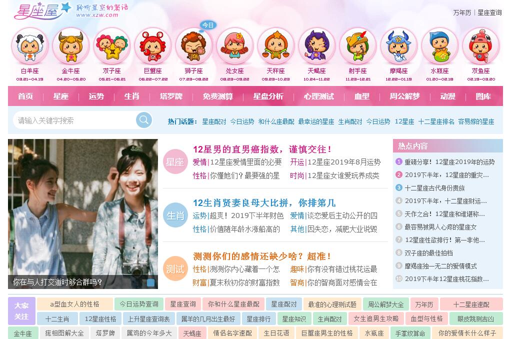 星座屋(www.xzw.com)是广东酷乐互娱科技股份有限公司的主打产品,创建与2011年6月1日,是一个集合中西方占星文化、命理推算文化、心理测试文化、星座周边产品为一体的综合性星座网站。通过3年的成长,星座屋已经居于星座垂直网站流量第1位,有多个星座相关APP产品上线百度,360,等大型搜索网站,并且成功上线了星座屋APP(安卓版),星座屋APP(苹果版)。星座屋已经形成了自己的星座形象与星座产品,网站信息涵盖了每日运势、12星座详解、生肖详解、星座配对、星座测算、心理测验、星盘占卜、血型分析、周公解梦、风水命理、星座图库等部分,通过官方微博,微信与飞信,每日为用户提供占星、推算、测试等全方位的服务。星座屋还致力于数据平台的开放,已为国内多家大型导航网站(例如:好123,百度,360导航等)提供API接口平台,让更多的用户可以通过星座屋获取到相关信息,并实现对信息进行定制与推送。致力与打造新一代星座形象品牌,以最好的用户体验服务广大用户,让你在生活之余可以体验和认知新的人生,了解更多的星座信息,通过星座屋平台结识更多的伙伴,让我们一起在星座屋的世界里遨游。星座屋提倡的宗旨是:准确!实用!免费!