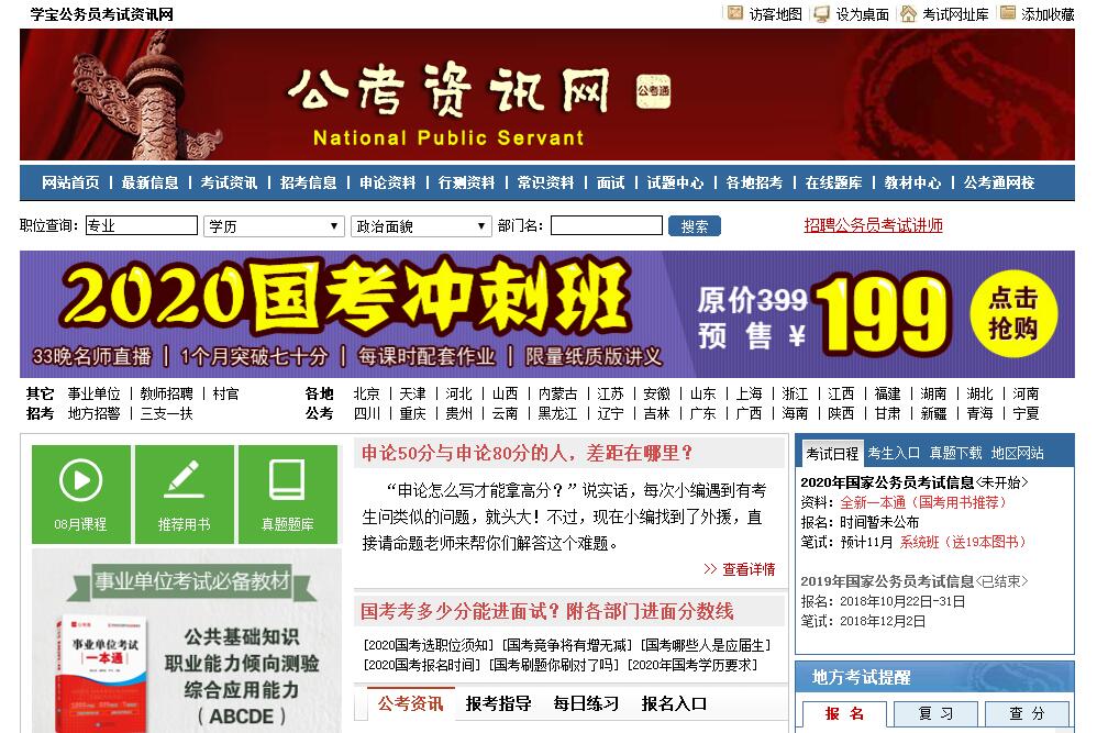 | 网站简介: 南京学宝教育科技有限公司成立于2005年,公司主要致力于提供公务员考试招考信息及图书策划与发行,经过近十年发展,目前公司已成为集国家公务员考试网(http://www.chinagwy.org/)及各地公务员考试网站、公务员考试在线题库、《公务员考试一本通》系列教材于一体的综合性教育培训企业。公司旗下现有《公务员考试一本通》、《公务员考试技巧手册》、《公务员考试实战题库》等系列教材,出版至今受到社会一致好评,在考生中享有很高的口碑,已经成为备战公务员考试的主要教材,为考生成功通过公务员考试提供了有力保障。公司旗下国家公务员考试网及各地公务员考试网站是全国领先的专门发布公职类考试资讯信息平台,信息覆盖全国31个省(市)、自治区。网站一直秉承“及时、权威”的理念,切合考生需求,为广大考生提供最新、最有价值的公务员招录信息,并从专业的角度细致解答考生各种疑问,深度解读录用政策,网站已成为考生最值得依赖的信息平台。未来公司将会在逐步完善现有服务的基础上,陆续提供视频在线学习、手机APP等资源,并最终形成一套完善的综合服务体系,力争以全方位服务优势,成为公考行业的标杆企业。 |