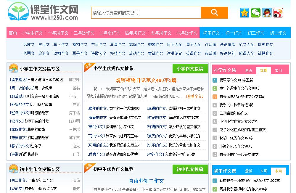 | 网站简介: 课堂作文网(KT250.COM)创建于2012年11月,是一家以提供小学生作文参考投稿、小学生课外阅读并涵盖部分初中作文的网站。写作文对于学生来说是一件很头痛的事,常常感觉无话可说,无事可写。而课堂作文网收集整理了类型齐全的小学生作文,并提供了学生作文投稿的入口,让学生可以借鉴参考其他同学写作文的方法,让我们真正感受到其实作文也是一种快乐。本站始终以广大同学的需求为导向,不断完善我们的服务,我们的目标就是成为您作文写作的好帮手! |