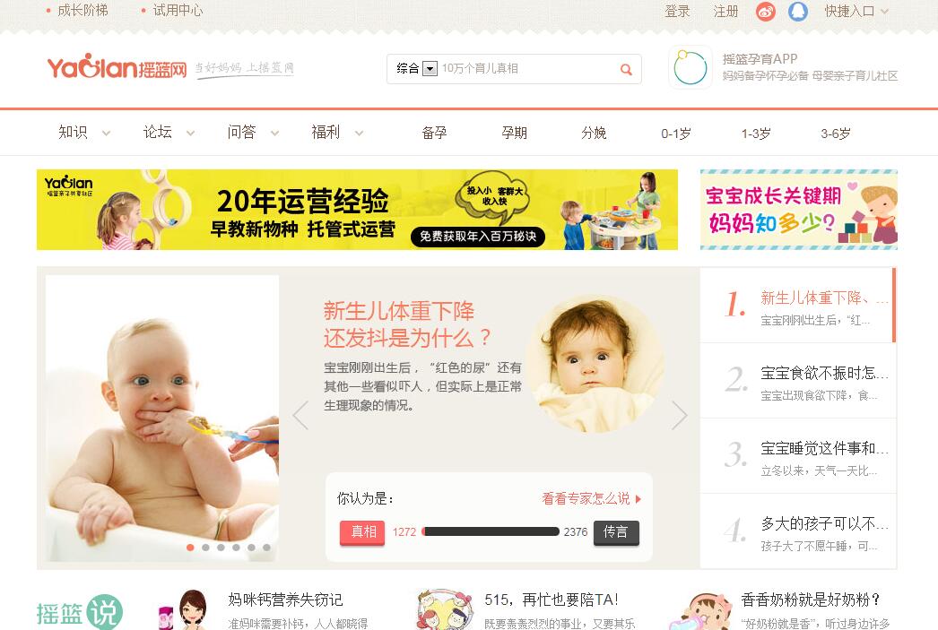 | 网站简介: 摇篮网www.yaolan.com中文母婴门户网站,隶属于北京世纪摇篮网络技术有限公司。1998年在美国硅谷创建,1999年12月15日正式上线。十余年专注造就专业品质,是年轻父母汲取专业、权威生养和教育知识的互联网站。面向全球华人,搭建父母和孩子的在线学习平台,提供从母亲怀孕到孩子六岁期间的生养知识、互动产品和咨询服务。让你和宝宝更出色!十余年来,摇篮网携手国内外儿童孕产妇、婴幼儿喂养、儿童教育等各种领域百位权威专家、始终如一的关注母亲和宝宝的健康生活和成长。通过十余年的积累,摇篮网已经拥有摇篮网(www.yaolan.com)、面向0—3岁父母的网络早教产品“成长阶梯”——给父母们提供专业的个性化家庭早教指导、线下亲子园——摇篮能量宝贝、《摇篮》电子杂志等跨媒体平台,并在为父母提供婴幼儿成长指导方案。近百万篇育儿知识应您所需、数百位专家每日在育儿问答与专家在线解答育儿难题,100万妈妈在亲子论坛分享他们的育儿心得、倾诉女人心情,850万妈妈在摇篮空间通过博客、相册、动画、视频、微博、分享等方式记录宝宝成长点滴,另有上百款育儿小工具、娱乐互动游戏尽在应用频道。 |