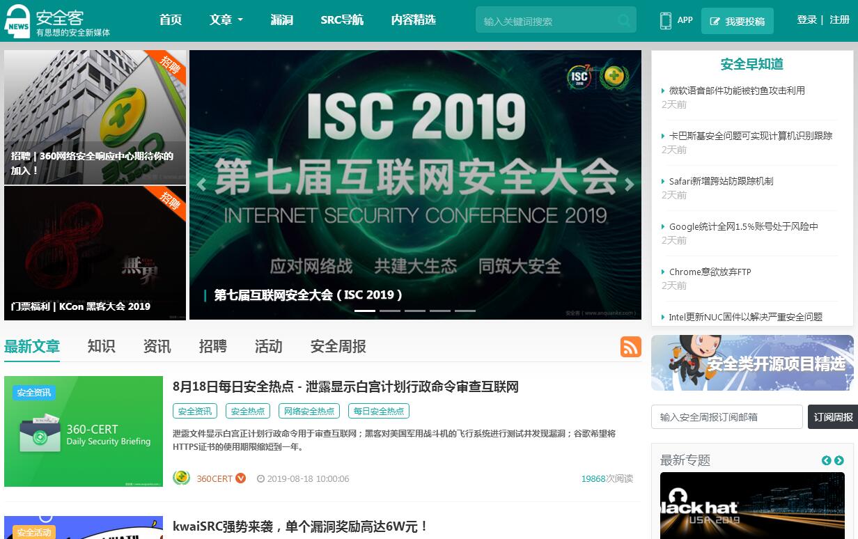 | 网站简介: 安全客是一个为广大安全爱好者和安全从业人员提供权威信息发布的漏洞信息、最新的安全资讯、最全的安全知识及精彩的安全活动的极具影响力的一站式安全平台。 |