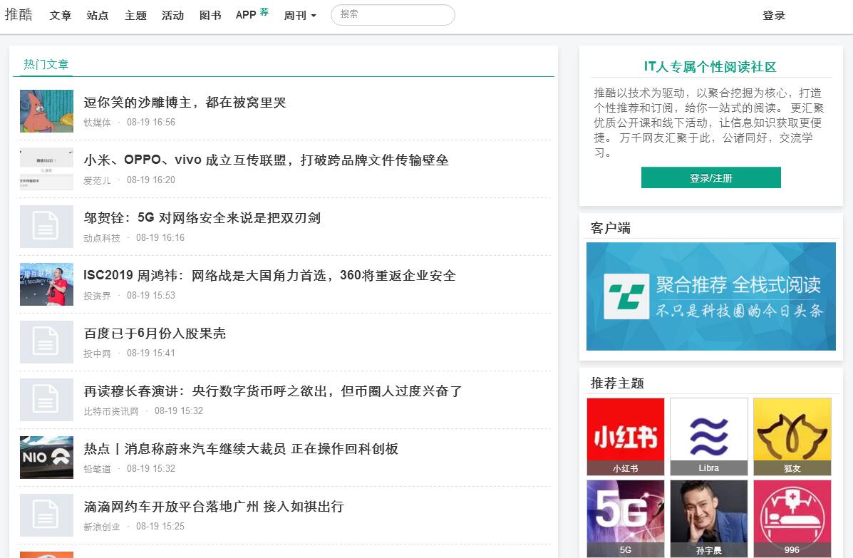 | 网站简介: 推酷专注于IT领域的信息挖掘和聚合推荐,期望通过技术解决信息获取方面的诸多问题。 更长远地,推酷期望能成为IT知识整合社区,给你一站式阅读、学习、交流的平台。目前主推的产品有:1)个性化文章聚合推荐,提供的内容涵盖科技、技术、设计、营销等方面。我们没有小编,聚合和推荐的内容完全依赖于分分钟不停歇的推荐系统。2)IT类的线下线上活动聚合推荐,目前收录的活动应该是国内最丰富的,但活动频道还有很长的路要走。除了网站,我们还提供优质的安卓和iOS客户端方便你的阅读。 |