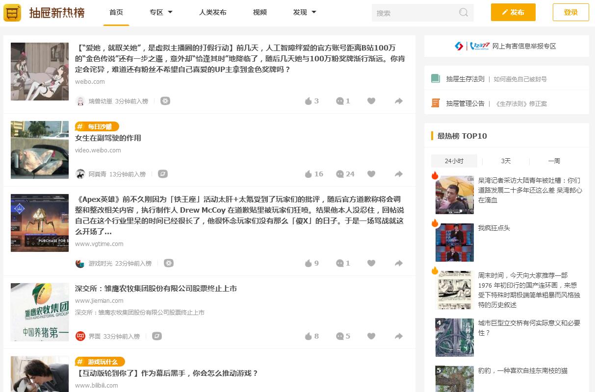 | 网站简介: 抽屉新热榜,汇聚每日搞笑段子、热门图片、有趣新闻。它将微博、门户、社区、bbs、社交网站等海量内容聚合在一起,通过用户推荐生成最热榜单。看抽屉新热榜,每日热门、有趣资讯尽收眼底。1987年9月14日,北京计算机应用技术研究所内发出了中国第一封电子邮件:“Across the Great Wall,we can reach every corner in the world.(越过长城,我们可以触摸世界的任意一个角落)”,当时整个中国互联网一天的资讯量可以用一张两指宽的纸条记录下来。今天,即使穷尽你的一生也不可能读完整个互联网一分钟内产生的资讯。作为工具的互联网已经进化成庞然大物。 但我们深信:工具必将被工具驯服。抽屉新热榜隶属于北京格致璞科技有限公司(www.Gozap.com),简称Gozap。Gozap是一个多终端信息整合平台。基于此平台将陆续推出其他服务。用户可使用同一帐号登录所有Gozap服务。抽屉新热榜处理的是人和信息的关系,目的是在未来发展成为社会化信息聚合平台,向用户高效、友好的提供有趣、热门内容,同时可以让用户分享的资讯、评论得到快速的传播。 |