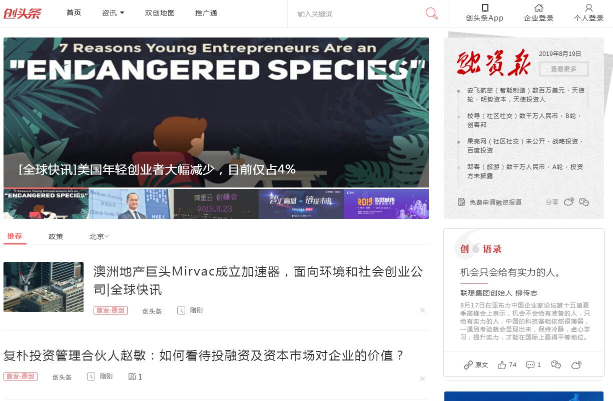 | 网站简介: 创头条为您提供创投圈最新鲜的创业资讯、投资资讯、互联网创业资讯等信息,致力于帮助创业者和投资人实现个性化定制,为创业企业提供优质的企业服务。 |