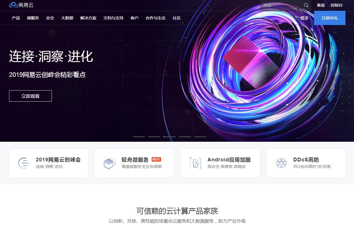 | 网站简介: 网易云,网易集团旗下云计算和大数据品牌,致力于提供开放、稳定、安全、高性能的基础技术平台和完善的云生态体系,帮助客户实现数字化转型与创新,促进其商业蜕变与持续发展,推动产业数字化升级。依托20余年技术积淀,网易云打造了轻舟微服务、瀚海私有云、大数据基础平台(猛犸)、可视化分析平台(有数)、专属云、云计算基础服务、通信与视频(云信)、云安全(易盾)、服务营销一体化方案(七鱼)等多类型产品,以及工业、电商、金融、教育、医疗、游戏等行业解决方案,并拥有完善的知识服务。截至2018年,网易云已服务45万企业客户,覆盖金融、电商、社交、教育、游戏、文化娱乐、医疗生物、制造业等行业。网易云专注于企业的数字化未来,深入行业,拥抱行业,愿与客户一起释放技术进步的潜能与价值。 |