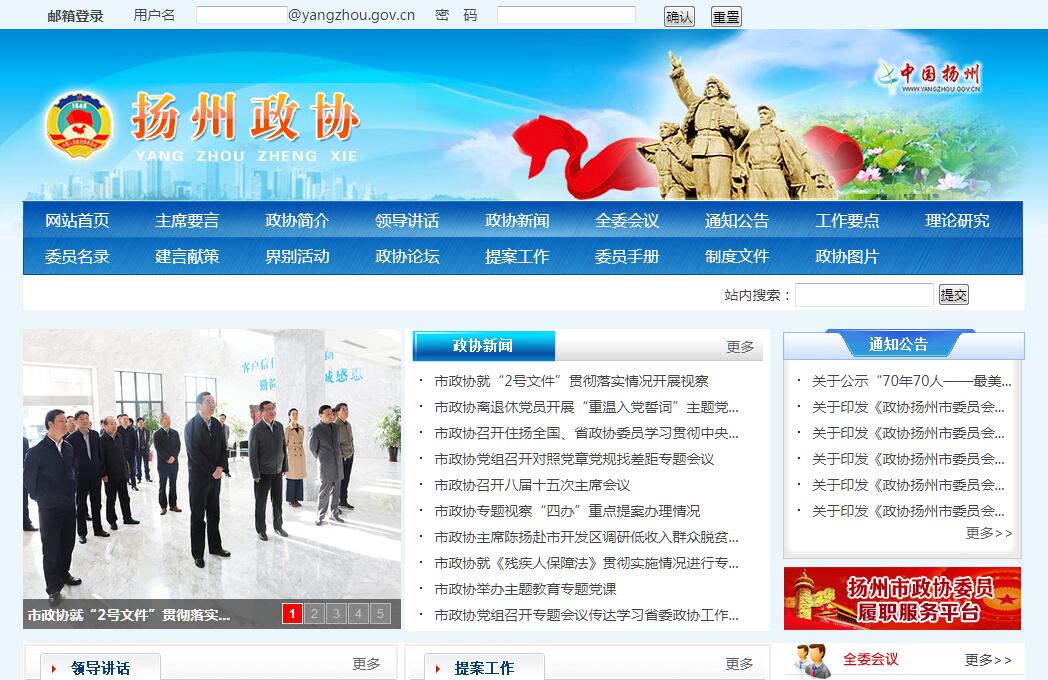 中国人民政治协商会议江苏省扬州市委员会(简称政协扬州市委员会或扬州市政协),是扬州市具有广泛代表性的爱国统一战线组织,是中国共产党领导的多党合作和政治协商的重要机构。1950年8月22日,扬州市各界人民代表会议协商委员会成立,主持和组织市各界人民代表会议的工作,至1955年10月先后选举产生了3届协商委员会。这期间,协助市委、市政府宣传和推行党和政府的政策法令,团结全市人民和一切爱国力量,稳定社会治安,巩固人民政权,宣传和动员人民支持抗美援朝、建立革命秩序、参加“三反”、“五反”和经济建设,推进各项社会改革,沟通政府与人民的联系,征求并反映人民意见,发展人民民主统一战线,在社会政治生活中发挥了重要作用。1955年10月15日至16日,由16个界别的代表组成政协扬州市委员会并召开一届一次会议。会议出席委员129人,由赵延林市长作报告,对政协工作提出了10项任务;江树峰代表扬州市各界人民代表会议协商委员会作工作报告;选举赵延林为政协主席。从1955年一届政协至1966年初四届政协的11年间,召开了9次会议,政协主席均由中共扬州市委书记兼任。这一时期,组织政协委员和推动各界人士积极投身各项政治运动和社会变革,参与组织全市的三大社会主义改造,组织学习“双百”方针,参加“整风”、“反右”,宣传总路线、大跃进、人民公社,投入社会主义教育运动,克服困难,建设国家,有力地促进了全市工作的开展。1966年至1976年这10年间,由于“文化大革命”的严重干扰破坏,政协工作处于瘫痪状态,各项工作被迫停顿,许多政协委员和各界爱国民主人士受到打击和迫害。举陆延鸿为政协主席。1983年3月31日,召开五届四次会议。这次会议是在中共江苏省委正式宣布扬州地区实行市管县的行政体制改革,撤销扬州地区行署,扬州市改为省辖市的情况下召开的。会议决定,为适应形势发展的需要,原扬州市政协五届委员会完成历史使命。1983年5月7日至14日,召开行政体制改革后的政协扬州市委员会一届一次会议。出席会议的委员431名,26个界别。会议开幕式由宗宇主持,方定一致开幕词,杨可夫致闭幕词。中共扬州市委书记傅宗华作重要讲话。议选举沙克为政协主席。1985年5月16日至21日,市政协召开一届三次会议,选举王子安为政协主席。1988年1月4日至9日,市政协召开二届一次会议,选举符宗乾为主席。1996年2月28日至3月3日,市政协三届四次会议选举施国兴为主席。2003年1月18日至21日,市政协五届一次会议选举徐益民为主席。2008年1月9日至12日,市政协六届一次全会选举徐益民为主席。 2012年6月26日至29日,市政协七届一次全会选举洪锦华为主席。2017年2月15日至18日,市政协八届一次全会选举朱民阳为主席。至此以来,市政协在中共扬州市委领导下,认真贯彻落实党的一系列方针政策,坚持党的基本路线,高举爱国主义和社会主义旗帜,突出团结和民主两大主题,紧紧围绕党政工作中心,发挥优势,履行职能,为促进全市的改革开放和现代化建设,巩固和发展安定团结的政治局面作出了应有的贡献。