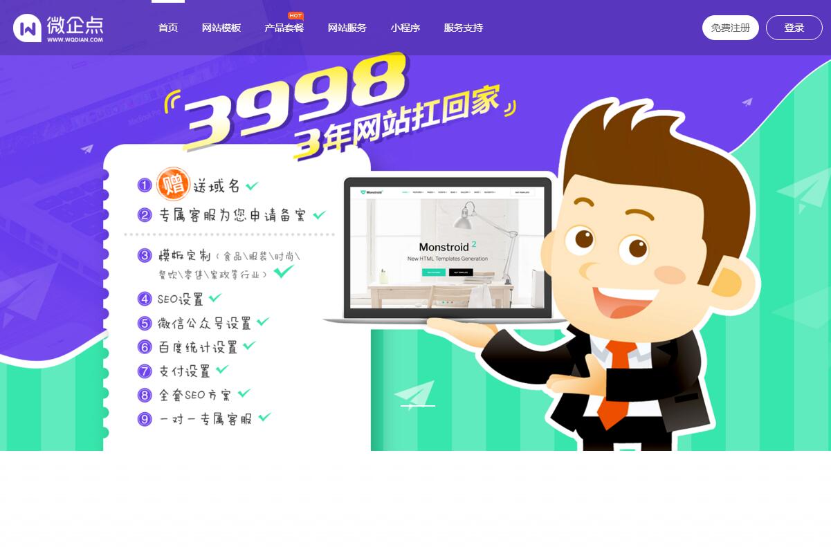 微企点是简单而强大的H5自助建站平台,采用的云计算和HTML5技术,实现零代码快速制作炫酷网站。微企点汇聚海量H5精美模板,采用可视化拖拽建站技术,操作简单,功能强大,一键上线,降低企业网站建设和营销成本。微企点致力于为中小微企业、创业创新者提供简单好用的一站式专业网站建设平台。微企点由北京中网企点科技有限公司运营,以SaaS服务模式打造在线自助建站工具。用户可以轻松制作企业网站、推广落地页(landingpage)、专题网页、个人主页,满足企业品牌宣传、产品展示、营销推广、数据收集、个人形象展示等需求。企业、机构、自媒体、微商、市场营销人员、个人都可以用微企点建站做网页。微企点可以根据不同访问终端,自动响应推送适应的网页,为终端用户带来良好的浏览和交互体验。微企点同时还提供一站式的网站托管、管理服务。用微企点建站做网页,零编程,上手快,颜值高,跨屏响应,并可以轻松对接微信、微博等移动应用,让H5网站网页能够自营销自传播。微企点核心创业团队有十多年的企业互联网服务的经验,产品还在快速迭代,每周更新。产品套餐灵活配置,提供专业的售后服务,快速响应客户需求。微企点推出后获得了大量用户的口碑推荐,并得到新浪、网易、搜狐、人民网、站长之家、新华网等主流媒体和36kr、虎嗅、钛媒体等众多新媒体的报道。北龙中网(北京)科技有限责任公司剥离微企点业务和团队,并投资组建北京中网企点科技有限公司,由后者运营微企点业务。北龙中网公司实力强大,背景深厚,是国内优秀的互联网基础服务商,中国互联网协会副理事长单位,多项国家行业标准的制定者。