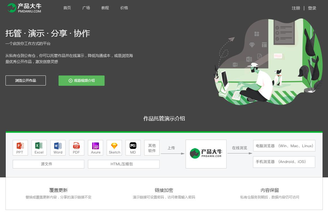 | 网站简介: 产品大牛是一个启发你工作方式的平台。从私有仓到公有仓,你可以托管作品并在线演示,降低沟通成本,或是浏览海量优秀公开作品,激发创意灵感。 |