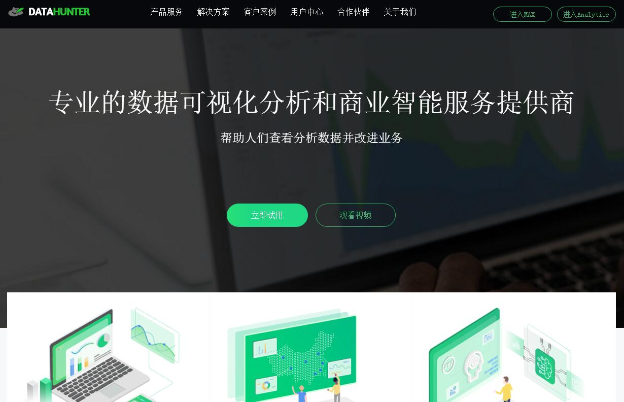 | 网站简介: 北京数猎天下科技有限公司(DataHunter)是一家专业的数据分析和商业智能服务提供商,注册于2014年。团队核心成员来自IBM、Oracle、SAP等知名公司,深耕大数据分析领域,具有十余年丰富的企业服务经验。DataHunter旗下核心产品智能数据分析平台Data Analytics、数据大屏设计配置工具Data MAX已在业内形成自己的独特优势,并在各行业积累了众多标杆客户和成功案例。成立以来,DataHunter就致力于为客户提供实时、高效、智能的数据分析展示解决方案,帮助企业查看分析数据并改进业务,成为最值得信赖的数据业务公司。 |