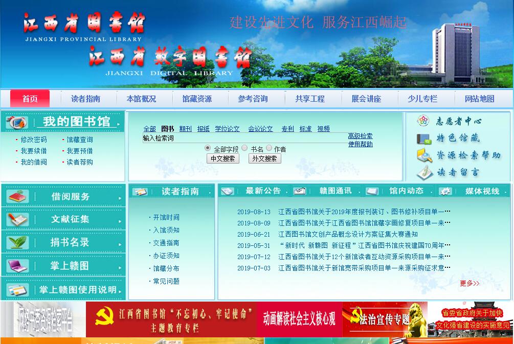 江西省图书馆创建于1920年,原馆址南昌市中山路171号,新馆位于南昌市洪都北大道198号,占地近百亩,大楼建筑面积2.5万平方米,是江西省规模最大、藏书最多的综合性公共图书馆,是全省文献资料、图书目录、馆际协作、图书馆学研究、信息交流和专业人才培训的中心。本馆的使命是“传承文明,服务社会”,其中读者服务工作的使命是:“一切为读者,为一切读者”、阅读推广工作的使命是“传播知识,推广悦读”;本馆的愿景是“走科学发展之路,办百姓喜爱之馆”。本馆采用主藏书楼与借阅服务楼两部分功能区的布局结构,设有采编部、特藏部、借阅部、报刊部、少儿部、信息咨询部、计算机技术部、研究辅导部、《图书馆研究》编辑部、财务科、人事科、保卫科、办公室、读者服务中心14个部门,配有多种现代化设备,采用图书馆自动化集成系统(ILAS)进行文献和读者服务管理。创办了国内外公开发行的学术刊物《图书馆研究》,2001年被文化部评为全国先进文化单位,2004年被评为二级图书馆。作为有“物华天宝、人杰地灵”美誉的文化大省的省级馆,本馆现有藏书310余万册,其中中文线装书50万余册。在收藏的图书、报纸、期刊、微缩品、视听文献和电子文献中,以珍贵的古籍珍善本和丰富的地方文献等特色藏书著称。中文线装书中已整理的珍善本有2089种,地方文献3500余部,地方志1200部。古籍中,南宋吉州周必大刻《欧阳文忠公集》装帧考究、刻印精良,堪为宋代江西刻书的代表作;明崇祯间宋应星自刻《宋应星(谈天·论气·野议·思怜诗)四种》系海内外孤本,极具科学价值;明嘉靖刻《江西通志》为现存江西通志最早最完善的版本之一,极具史料价值;明代经折装瓷青纸金粉写本《太上洞玄灵宝无量度人上品妙经》则是集装帧、书法、绘画艺术为一体的绝妙珍品。地方文献中的《江西民国日报》、《江西省政府公报》、《江西地方教育》等 则以其收藏完整、独具史料价值而为学人瞩目。江西省图书馆设立了社科、自科、文学、外文、中文现刊现报阅览室、中文过刊过报借阅室、少儿图书借阅室、特藏文献阅览室、康复阅览室、电子阅览室、自学阅览室、文献资料复印室、数字图书馆体验中心、总服务台等十多个读者服务窗口,阅览座位1200余个,年接待读者达100万人次。江西省图书馆建立了自己的网站(域名为www.jxlibrary.net),读者可在本馆(或通过网站)检索馆藏中文图书的书目数据。本馆注重加强图书馆的社会教育职能,依托读者服务部门和“读者之家”,广泛利用社会资源,配合党和政府的中心工作,面向广大读者,全面开展读书及宣传服务活动。图书馆服务宣传周、全民读书月、全省读书演讲大赛、科普宣传日、送书下乡等读者活动声势浩大,影响广泛。本馆创立的“赣图大讲堂”“赣图展览”“兰兰姐姐故事会”“贝贝乐园”“少儿‘双有’教育公益影视展播”“中华民族传统文化艺术鉴赏”“一日图书管理员”等品牌服务项目以及各种知识竞赛、读书演讲、英语沙龙等常年开展的系列读书活动,丰富了读者的阅读生活,拓展了图书馆的社会功能。本馆开辟的分馆和图书流通站(点)遍布社区、乡镇、学校、部队、监狱,是本馆延伸服务领域所做得重要工作。位于本馆的全国文化信息资源共享工程江西分中心已初具规模,中心配置了高性能服务器、存储设备、防火墙和数字资源加工制作设备等,数字资源建设颇具地方特色、数字资源服务系统和技术支持体系能有效服务于全省各级分中心和基层点,可提供远程数字化信息服务,丰富了广大人民群众的精神文化生活。