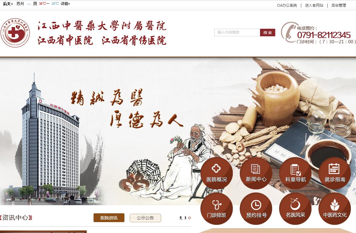 江西中医药大学附属医院(江西省中医院、江西省骨伤医院)是三级甲等中医医院。是江西中医医疗、教学、科研、预防保健的龙头和中心医院。是全省规模最大、学科设置最全、技术力量最雄厚、医教研紧密结合的现代大型综合中医医院。医院是江西省中医医疗集团理事长单位,是全国中医药文化宣传教育基地和首批国家药品不良反应监测哨点单位,是国家中医临床研究基地建设单位。目前,医院已经形成了“一院三区多门诊”的发展格局,分别是总院、抚生院区、红谷滩分院和阳明路门诊部。其中,总院位于繁华的老城区中心地带的八一大道和福州路交汇处,地铁2号线旁。抚生院区揽江入胜,位于风光迤逦的赣江江滨,是医院的新院区。医院各院区和门诊部均有地铁直达(2号线直达总院和阳明路门诊部,4号线直达抚生院区,1号线直达红谷滩分院)。医院历史悠久,底蕴深厚。医院的前身是1954年5月创立的江西省中医实验院。1957年,医院划归江西医学院,更名为江西医学院附属中医实验院。1959年,江西中医学院成立,经江西省人民委员会批准,在中医实验院的院址兴建江西中医学院附属医院,定院名为江西省中医院(江西省中医院的院名沿用至今),是全国最早一批省级中医医院。1962年,经过三年多的建设,江西省中医院正式开业接诊。1966年,医院更名为江西中医学院附属医院。1970年,因江西中医学院被合并,医院也划归江西医科大学领导,更名为江西医科大学附属中医院。1973年,江西中医学院恢复办学,医院重新划归江西中医学院领导,更名为江西中医学院附属中医院。1990年,医院再次更名为江西中医学院附属医院。2003年,医院增挂江西省骨伤医院牌子。2013年5月,江西中医学院更名为江西中医药大学,医院也随之更名为江西中医药大学附属医院。医院先后获得“全国医药卫生系统先进集体”、“全国卫生系统行风建设先进集体”、“全国中医药应急工作先进集体”、“全省先进基层党组织”、“全省医药卫生系统先进集体”、“江西省群众满意医院”、“南昌市民最满意医院”、“江西省百姓健康服务十佳医疗单位”、“江西省平安医院”、“江西省教育系统节能考核先进单位”等数十项荣誉称号。医院现有在岗职工1600余人,具有副高及以上专业技术职称300余人,博士生导师13人,硕士生导师110人。其中有国医大师2人(洪广祥、伍炳彩),全国名中医3人(皮持衡、张小萍、范崔生),省国医名师7人【许鸿照、何晓晖、陈崑山、周士源(女) 、赵纪生 、贺支支(女) 、喻文球】,全国老中医药专家学术经验继承指导老师(国家级名老中医)37人,江西省名中医81人,享受国务院特殊津贴专家19人,国家中医药管理局学科带头人8人,全国优秀教师2人,全国中医药高校教学名师2人,全国优秀中医临床研修人才22人。长期负责马来西亚、新加坡、香港大学等国家地区的中医药课程,并为20多个国家提供中医药教育,为本项目的实施提供了人员保障和对外医疗、培训经验。医院开放病床1700余张。有百级、千级、万级层流手术室12间。有省内首台宝石能谱CT,拥有3.0T和1.5T核磁共振、DR、全自动生化分析仪、数字减影血管造影系统(DSA)等一大批一流的仪器设备。医院专科门类齐全,设有急诊科、肺病科(呼吸内科)、脾胃肝胆病科、心血管病科、脑病科(神经内科)、肾病科、血液病科、糖尿病科(内分泌科)、风湿病科、肿瘤科、妇科、儿科、皮肤科、骨伤科、针灸科、康复科、肛肠科、眼科、耳鼻咽喉科、中医外科、外科、口腔创伤整形科、结石科、重症医学科、麻醉科、超声诊断科等40多个临床、医技科室。医院拥有国家临床重点专科7个,分别是:针灸科、妇科、外科、肺病科、心血管病科、脾胃病科、护理学;拥有国家中医区域诊疗中心2个,分别是:针灸科、心血管病科;拥有国家中医药管理局重点专科(专病)12个,分别是:针灸科、肺病科、妇科、骨伤科、外科、急诊科、心血管病科、肛肠科、脾胃病科、耳鼻喉科、护理学、毒蛇咬伤。医院与江西中医药大学临床医学院、针灸推拿学院合署办公。拥有一级学科博士学位授予点1个(中医学)、硕士学位授予点11个(中医临床基础、中医儿科学、中西医结合临床、中医肛肠病学、中医内科学、中医外科学、中医骨伤科学、中医妇科学、中医五官科学、针灸推拿学、全科医学)。医院设有22个学科组,分别是:中医内科学科组、中医外科学科组、中医妇科学科组、中医儿科学科组、中西医结合内科学科组、中西医结合外科学科组、中西医结合妇科学科组、中西医结合儿科学科组、中医眼科学科组、中西医结合眼科学科组、中医耳鼻喉科学科组、中西医结合耳鼻喉科学科组、西医内科学科组、西医外科学科组、中医临床基础学科组、骨伤学科组、针灸治疗学科组、康复学科组、经络腧穴学科组、刺法灸法学科组、实验针灸学科组、推拿学科组、中医养生学科组。医院教学成果突出,医院在拥有国家中医药管理局重点建设学科8个,分别是:肺病学、针灸学、骨伤学、伤寒学、疮疡学、心病学、康复医学和全科医学。医院获得国家教学成果一等奖1项(《新时期高等中医药院校‘基础素质’教育理论创新与‘双惟模式’实践”》——2014年)、二等奖2项(《产学研结合培养中药创新人才教育模式研究与实践》——2009年;《高等中医药院