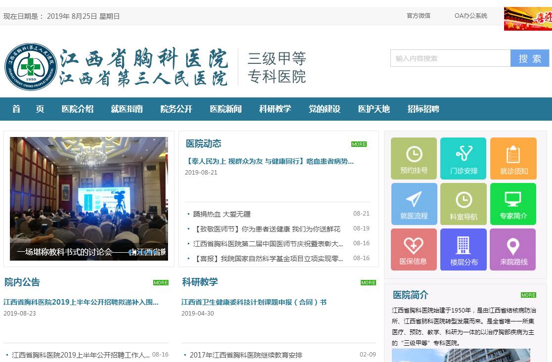 江西省胸科医院始建于1950年,是由江西省结核病防治所、江西省肺科医院转型发展而来(1992年增挂“江西省肺科医院”牌子,实行两块牌子一套人员;2004年2月更名为“江西省胸科医院”,同年9月增挂“江西省第三人民医院”牌子)。是全省唯一一所集医疗、预防、教学、科研为一体的以治疗胸部疾病为主的“三级甲等”专科医院。是南昌大学医学院和江西中医药大学的教学医院和研究生培养定点医院。医院还承担了全省结核病及其他传染病的定点收治任务,是江西省突发公共卫生事件医疗救治中心;承担了全省社区卫生技术工作的指导、培训任务,为江西省社区卫生技术指导中心。2014年2月11日,经省卫生厅批准获得尘肺病诊断机构资格,成为江西省唯一获得该资质的三级甲等医院。医院分两个院区:叠山路院区和红谷滩院区,医院占地面积94.91亩,建筑面积3.7665万平方米,医疗用房3.1万平方米。设有胸外科、心血管内科、呼吸内科、肿瘤科、结核科、神经内科等临床医技科室30个,职能科室23个,其中有1个院士工作站,3个省医学领先学科,1个省医学领先建设学科,1个国家卫计委呼吸内镜培训基地,1个国家中医药管理局重点研究室,一个省医学会主委单位(结核病分会),四个研究型医院主委单位(神经感染与神经免疫学分会、介入呼吸病学分会、胸部微创外科学分会、肿瘤分会)。编制床位1000张,开放病床800张;现有在职职工711人,其中正副教授、正副主任医师120名,医学博士7名,医学硕士80余名,硕士生导师9名。江西省卫生系统高层次学术学科带头人1名,省卫生厅学术技术带头人培养对象15名。配备依柯达高能直线加速器、64排全身螺旋CT扫描机、直接数字化X线摄影机、大型数字减影C型臂、史塞克电子高清胸腔镜、电子支气管镜、史托斯硬质支气管镜、多功能进口麻醉呼吸机、杜邦和日立全自动生化仪、血气分折仪、DNA扩增仪、细菌快速培养仪、彩色超声诊断仪、肺功能仪、呼吸睡眠监测仪等先进设备。医院坚持“科技兴院”的理念,近年来获省级科技成果奖13项,获国内先进水平的科研成果32项,填补省内空白16项,医学专著4部。胸外科、呼吸内镜介入科、结核内科是江西省医学领先学科,肿瘤学科是江西省医学领先建设学科。呼吸科、心血管科、神经危重症学科是医院重点建设学科。胸腔镜微创外科手术、气管支气管镜微创介入手术达国内先进水平,难治性肺结核及耐多药肺结核病人的治疗技术处于省内领先水平。医院内镜中心2008年被卫生部授予“国家卫生部呼吸内镜培训基地”,2017年10月被中国医师协会内镜分会授予江西唯一、全国首批40家呼吸内镜培训基地之一。面向全国进行内镜医师培训,年平均开展气管、支气管介入手术1万例次,支气管镜检查例数居全省之首。医院率先引进开展了“大容量全肺灌洗术”,为广大尘肺患者带来福音,省内外尘肺患者慕名而来,满意而归。医院不断深化医改举措, 加强科学管理,提高医疗质量水平。2017年8月牵头组建了江西省结核病专科医联体,2017年9月加入了上海肺科医院专科联盟、北京胸科医院创新联盟及中日医院呼吸专科医联体间质性肺疾病协作组,充分优化资源配置,形成上下联动、优势互补、资源共享的运行机制;作为中华社会救助基金会“大爱清尘”基金定点医院,全力承担起江西地区尘肺病患者的医疗救治工作; 2017年12月与中国工程院廖万清院士签署成立致病真菌临床医学研究院士工作站,建立疑难真菌感染性疾病诊疗体系,共同提高为百姓健康服务的水平。2018年6月通过省卫计委专家评审,授予“第三周期医院评审三级甲等医院”称号。医院以“厚德、仁爱、专邃、为先”为院训,坚持以“患者第一、质量第一、服务第一”为宗旨,以精湛的技术、良好的医德竭诚为广大人民群众提供优质的医疗保健服务。近年来,先后荣获“江西省省级文明单位”、“江西省群众满意医院”、“江西省卫生系统行风建设优良单位”、“厅直卫生系统社会治安综合治理目标管理先进单位”“全国百姓放心示范医院”等称号。