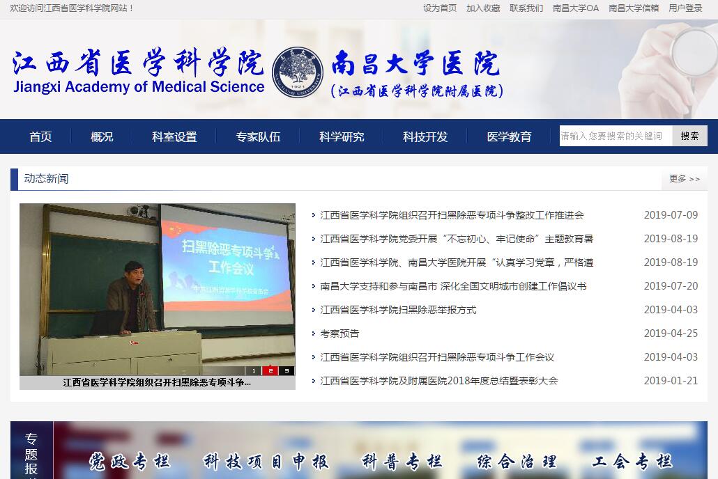 江西省医学科学院(以下简称“医科院”),医科院医学科研大楼位于南昌市东湖区八一大道461号,是全省唯一一所基础医学科研机构。医科院始建于1958年,其前身为中国医学科学院江西分院;1972年恢复重建,更名为江西省医学科学研究所,隶属江西省卫生厅,该所秉承“科研立身、服务社会”的宗旨,长期致力于基础医学领域的研究,涌现和培养了一大批优秀的高层次医学科研人员,为江西医学科研事业做出了突出贡献;1983年经省政府批准,根据医、教、研三结合形势发展需要,医科所在行政上归属于原江西医学院领导;2005年随江西医学院和南昌大学合并并入新的南昌大学;2012年9月更名为江西省医学科学研究院;2015年5月正式更名为江西省医学科学院。由所改院后的江西省医学科学院现有八个研究所,三个中心,医科院现有一个国家级科研转化平台(“国家干细胞临床研究机构”)、二个省级科研转化平台(“江西省人体干细胞应用技术工程研究中心”、“江西省基因检测示范中心”)、一个省级重点实验室(“江西省医学免疫与免疫治疗重点实验室”)、两个省级培养创新基地(《江西省研究生培养创新基地》和《南昌大学研究生培养创新基地》)。医科院现有专业技术人员62人,高级职称以上科研人员17人。兼职专家、教授25人,“赣鄱英才555工程”人员3人,“井冈学者” 1人,“5511江西省创新人才” 1人。据不完全统计,近年来,医科院承担国际合作项目及国家级、省厅级以上项目共60余项,获省厅级以上科技成果奖项4项,招收培养博士、硕士研究生60余人。同时,还承担了部分“博士后工作站”的工作。 几十年来,随着江西省科研事业的发展,经过几代医科院科研人员59年辛勤耕耘,医科院的医学科学研究及服务实力不断增强,给医学科研带来了生机和活力。目前医科院已发展成为科室齐全,科研力量雄厚,具有良好的科研条件和人才队伍,历经五十多年发展壮大,已储备了同行业中有较大优势的科研力量、科研成果和服务经验,业务范围涉及医学科研、科研成果转化、研究生培养等多个领域,现已成为集基础、应用、科研、服务为一体的省级综合性医学科研机构,已经从单纯的从事基础医学科学研究拓展到食品检测和医疗卫生的领域,是江西省医学科研战线的一支主力军。
