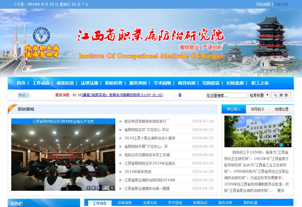 江西省职业病防治研究院成立于1958年,前身为“江西省劳动卫生研究所”,1962年与“江西省原子医学研究所”合并,改称为“江西省工业卫生研究所”,由于职能调整需要,1986年改称为“江西省劳动卫生职业病防治研究所”,为适应科学发展要求,2009年9月经江西省机构编制委员会批准,改称为现在的“江西省职业病防治研究院”,2011年4月省机构编制委员会批准我院增挂“江西省职业卫生检测中心”。我院是江西省省级疾病预防控制机构之一,主要负责全省职业病预防控制、职业卫生与放射卫生技术服务、毒理学试验与化学品毒性鉴定、食品及健康相关产品检测、实验动物质量检测等工作,是全省职业病诊断、鉴定、治疗和康复的权威机构,是全省职业卫生、放射卫生技术指导中心,也是全省唯一的一类化学中毒医疗救治基地。我院位于南昌市中心城区,交通便利,总占地面积24,000㎡,院内绿化面积8,300㎡,绿化率达35%;现有职业病医院大楼、职业卫生与放射卫生实验大楼、毒理学试验大楼、实验动物大楼、办公大楼、以及辅助用房等数栋,面积约11,840㎡;拥有本学科较先进的各种仪器和设备等固定资产近3,000余万元,藏书17,000余册,中外文期刊190多种,全院实现全自动化办公与管理;目前全院在职职工136人,其中高级职称30人,中级职称51人;其中博士1人,硕士19人;大学本科72人;拥有南昌大学硕士生导师资格5人,东华理工大学硕士生导师资格1人;专业涵盖职业卫生、放射卫生、临床医学、分析化学、药物化学、生物医学、通风工程、环境工程、实验动物等多种学科。我院现设行政办公室、党委办公室、业务科、财务科、总务科五个职能科室和职业卫生监测站、放射卫生监测站、职业病医院、毒理室/医学实验动物中心、中心实验室、实验动物质量检测站六个业务科室。我院先后取得国家“实验室资质认证”、卫生计生委“化学品毒性鉴定机构(甲级)”、农业部“农药登记试验单位(B级)”、江西省 “职业卫生技术服务机构”、“职业健康检查机构”、“职业病诊断机构”、“医疗机构执业许可”、“实验动物质量检测机构”、“实验动物使用许可”、“食品及健康相关产品检验机构”、“消毒产品生产企业卫生检测机构”、“二级微生物生物安全实验室”等12项资质。建院50年多来,在上级主管部门的关心和支持下,我院在职业病预防控制、职业卫生与放射卫生技术服务、毒理学试验等工作中取得了较大的成绩,曾先后获得省、部级科技成果奖50多项,科技成果鉴定100多项,为保护劳动者职业健康,促进劳动力资源可持续发展,构建和谐平安江西发挥了重要作用。近几年来,我院坚持“爱院、敬业、严谨、创新”的院训,坚持“消除职业性危害,保障劳动者健康”的服务宗旨,不断改革创新,不断完善自身发展,不断增强服务功能,主动转变职能,积极拓展服务市场,业务能力和技术水平再上一个新台阶,实现了社会和经济效益双丰收。全院干部职工表示,要以科学发展观为指导,以一流的精神状态、一流的技术水平,争创全国一流职防院所,不断推进全省职防事业又好又快发展。