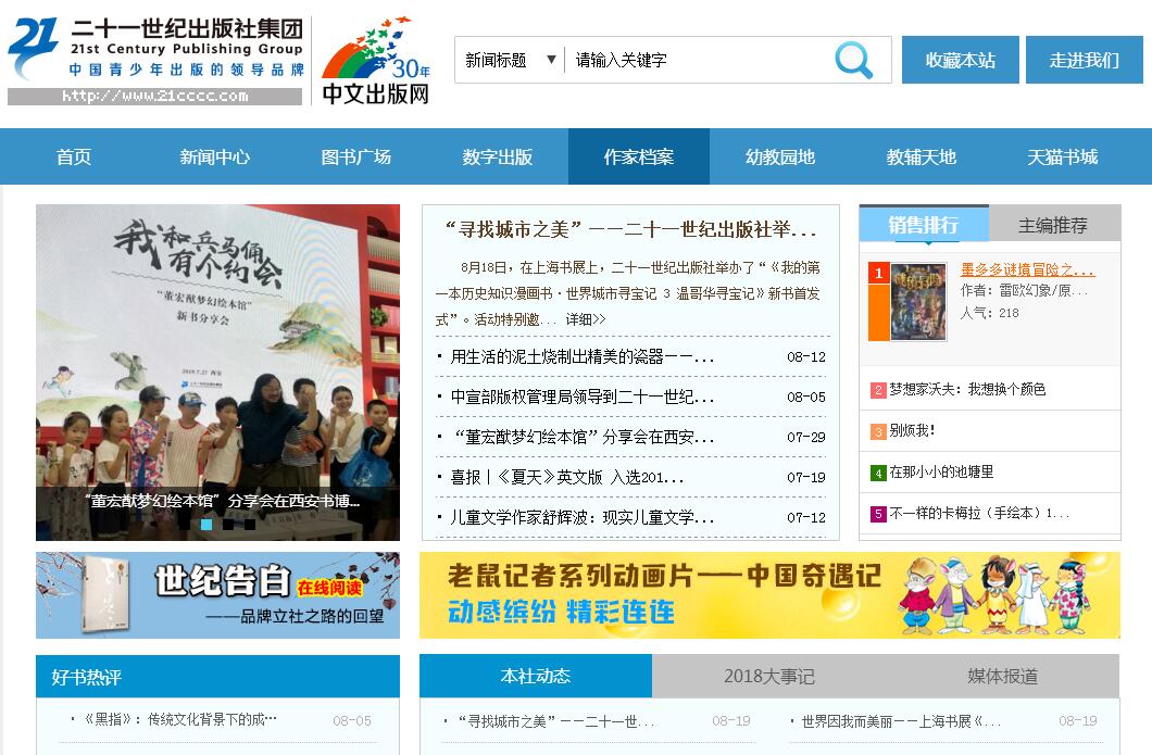 | 网站简介: 二十一世纪出版社集团有限公司前身为二十一世纪出版社,成立于1985年2月。2014年12月1日,挂牌成立二十一世纪出版社集团有限公司,成为国内首家内生裂变而成的少儿出版集团。该社打造了一大批国内知名品牌图书产品线,如:曹文轩“我的儿子皮卡”系列、“大中华寻宝”系列、“不一样的卡梅拉”系列、“彩乌鸦”系列、“彩乌鸦中文原创”系列、“郑玉巧育儿”系列、“不老泉文库”、“我的第一本科学漫画书”系列等。并屡获国家级大奖,其中6次荣膺“五个一工程”图书奖、2次中国出版政府奖、4次中华优秀出版物奖。2018年年造货码洋12.29亿元,销售收入5.06亿元,市场占有率稳居全国少儿出版社第一。2009年,被国家新闻出版总署授予“全国百佳出版单位”称号;总体经济规模综合排名居全国少儿社第一;在版权方面,曾荣获“世界知识产权组织版权金奖推广运用奖”,被评为“全国版权示范单位”; 2013年被国家新闻出版广电总局列为首批“数字出版转型示范单位”; 2015年3月30日,在第52届博洛尼亚书展上被评为“2015世界年度最佳童书出版社”,是亚洲地区唯一获得该项殊荣的出版社。 |