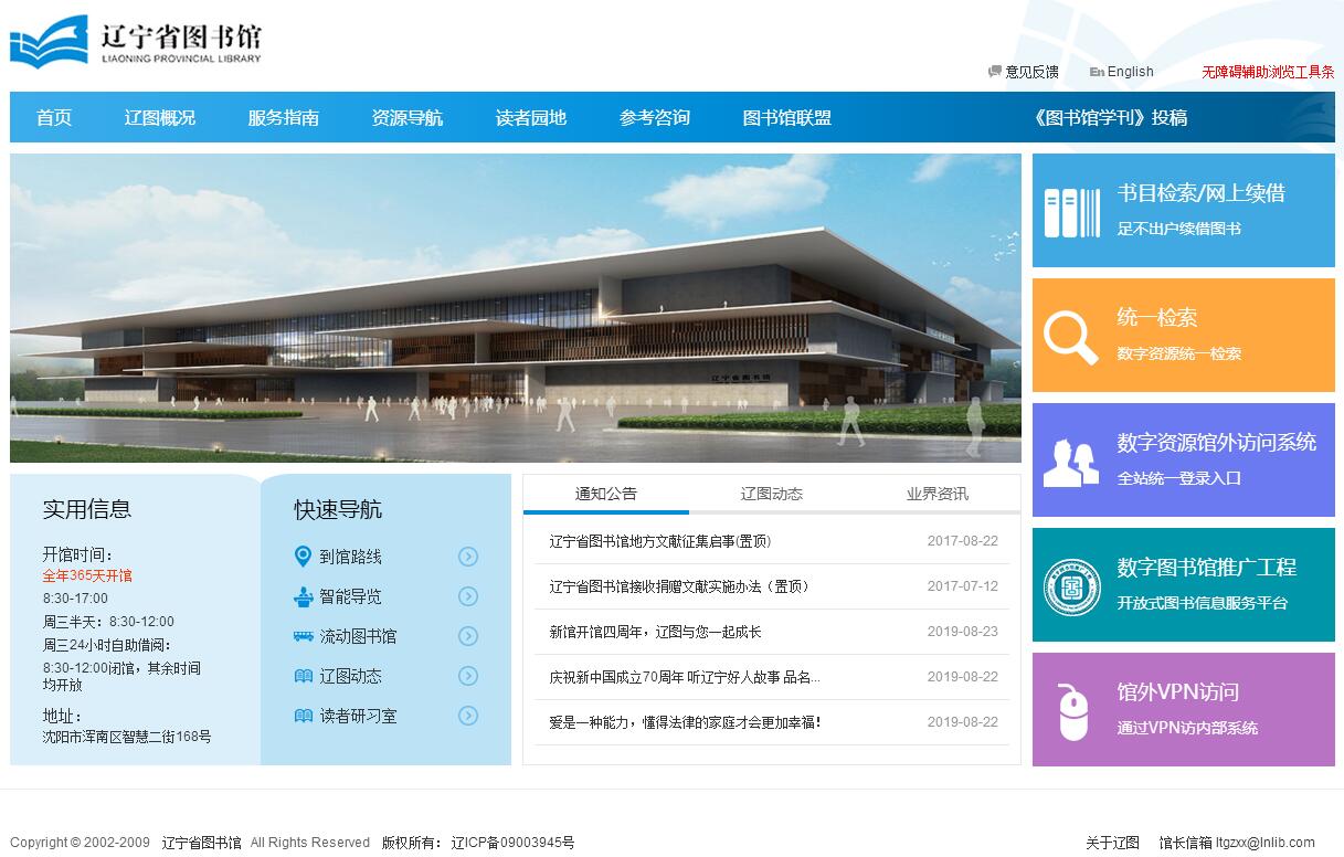 辽宁省图书馆原名东北图书馆,是中国共产党领导下建立的第一所大型公共图书馆,于1948年8月15日在哈尔滨开馆,1949年2月迁至沈阳,1955年改名辽宁省图书馆,2015年新馆建设完成并试开馆,2017年4月全面开馆,新馆建筑面积10万平方米。辽宁省图书馆现有馆藏文献650余万册(件),古籍文献61万册,善本书12万册,宋元版书100余部,还藏有丰富的东北地方文献和有关满族、清代以及伪满时期的文献资料。多年来,省图书馆本着“创新、共享、开放、均等”的服务理念,充分利用图书馆的设施、文献、技术等资源,为读者提供优质、高效的服务:“辽图讲座”“辽图展览”“全民读书节”“双节文化活动”“图书馆服务宣传周”“流动图书馆——百万图书万里行”“影音欣赏”“全民学习中心”及“文化志愿服务”等形式各异的公益文化活动,营造了浓郁的读书氛围,得到了广大读者的好评;并打造了“手语世界”“对面朗读”“乐龄俱乐部”“童阅乌托邦”等温馨、务实的服务品牌,满足了特殊群体的文化需求。近年来,省图书馆顺应现代技术发展,逐步推出移动图书馆、微信图书馆、电子阅读器等服务内容,为读者提供数字阅读体验。阅读无止境,服务无止境,在未来的发展中,省图书馆将不断创新服务模式、深化服务内涵、拓展服务范围,努力在保护文献典籍、传承中华文化、培养公民的文化自觉和文化自信、推动全民阅读深入开展等方面发挥重要作用。
