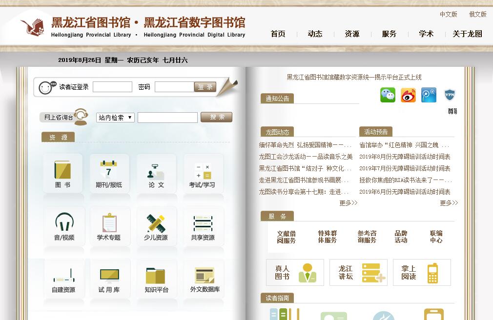 黑龙江省图书馆是国内创办最早的省级公共图书馆之一,是面向社会公众开放、提供图书、报刊借阅和参考咨询等多功能的公共文化服务机构,是全省公共文化服务体系建设的重要组成部分,发挥着保存人类文化遗产、传递科学情报、开展社会教育和提供文化娱乐等各种功能,是展示龙江人文资源、对外文化交流的重要窗口。黑龙江省图书馆始建于1906年(清光绪三十二年),前身为黑龙江将军署学务处在齐齐哈尔市创办的图书馆。1954年原黑龙江省与原松江省合并为新的黑龙江省,省会由原来的齐齐哈尔市改设在哈尔滨市,原黑龙江省图书馆便更名为齐齐哈尔市图书馆。1957年,在哈尔滨市筹建新的黑龙江省图书馆,1961年,8600多平方米的馆舍竣工,1962年5月5日正式开馆。2003年10月,又在长江路216号建成新馆,馆舍建筑面积33000平方米。设计藏书规模350万册、日接待到馆读者3000人次,接待互联网访问40000人次。黑龙江省图书馆现有藏书351万余册(件)。其中,中外文图书281万多册;古籍13万余册;报刊33万余册;缩微制品18万余件;视听资料2万余件;数字资源总量达402.96TB。由于地缘关系,还藏有大量俄文、日文资料;收藏地方文献有近2万种,集中反映了东北地区和省地矿地貌、物产资源、工农业生产和风土人情。馆藏善本书385种6602册,其中后唐卷轴写本《大般若波罗蜜多经》、宋刻本《通鉴纪事本末》、元刊本《新编事文类聚翰墨大全》和《韵府群玉》、等25种馆藏珍品列入国家珍贵古籍名录。自1980年起,与日本、美国、加拿大、苏联、朝鲜、新加坡等7个国家的15个图书馆建立了书刊交换关系。黑龙江省图书馆对外开放的服务区有读者服务大厅、多功能厅、文献借阅、报刊阅览、地方文献阅览、电子文献阅览、微型影院、24小时自助图书馆、24小时数字图书馆等,并为自习读者、少儿读者、残障人群特设了服务区域,共计20多个阅读活动场所,总阅览座位2000多个。设有面积分别为700平方米的公益性展览厅和学术报告厅等服务设施。2008年起,在全省边境县、贫困县、重点旅游景区、边防部队、农垦农场、森工林业局建设了73个流动图书馆分馆、数字图书馆分馆;在全国率先探索、自主构建了6000里边疆数字文化长廊。黑龙江省图书馆是全国文化信息资源共享工程黑龙江省级分中心;黑龙江省古籍保护中心;还是黑龙江省数字图书馆工程建设的中心馆,拥有超大容量的分布式资源库群、超大规模用户的访问能力,建成了全省共享的公共数字文化云计算服务平台,实现全年365天、24小时面向全球提供多媒体存取、远程网络传输、智能化检索、跨库无缝链接等数字图书馆服务。黑龙江省图书馆始终坚持“读者至上,服务第一”的宗旨,从馆内服务项目的确立到服务设施的改善,均从方便读者、服务读者出发。黑龙江省图书馆的服务也得到了社会各界的认可,先后被授予国家“一级图书馆”、 “全国文明单位”、“全国文化系统先进集体”等光荣称号,并被国务院批准为首批“全国古籍重点保护单位”。今后,黑龙江省图书馆将继续创新体制机制、创新服务意识、创新传播手段,充分发挥传承文明和传播知识信息的优势,在推动社会主义文化大发展大繁荣的伟大历史进程中,为公共文化服务体系的构建做出更大的贡献。