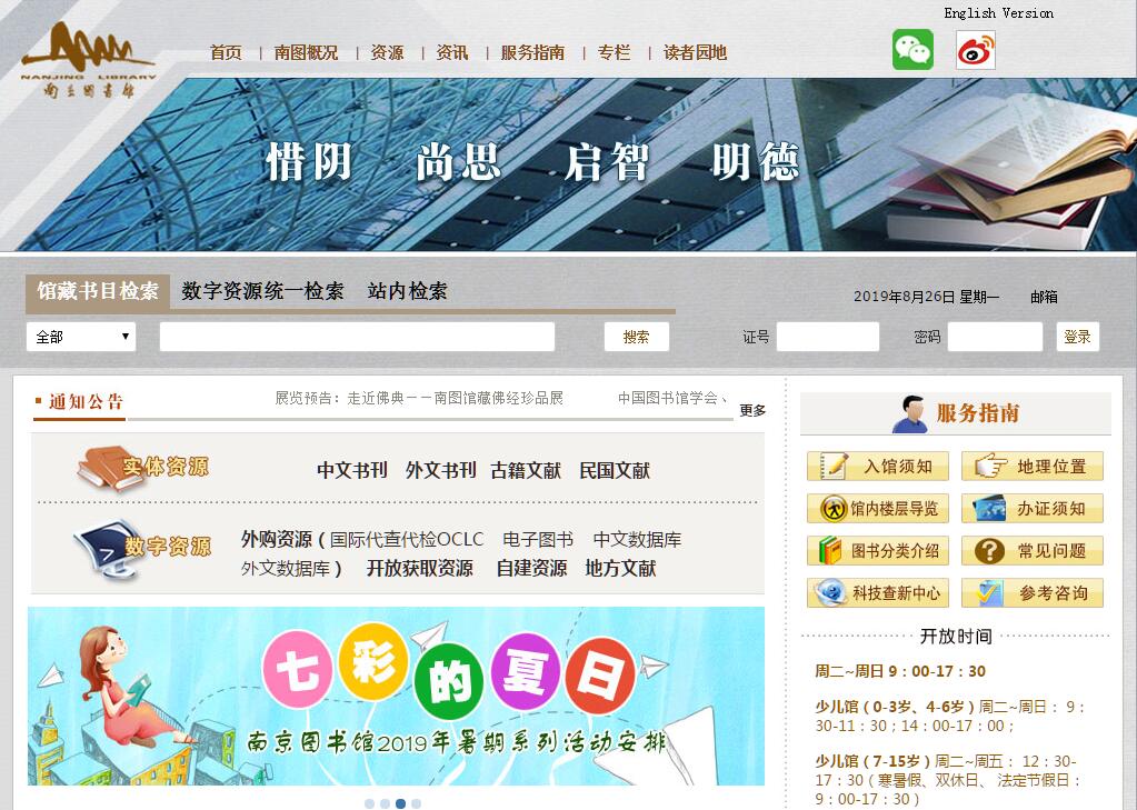 南京图书馆是江苏省省级公共图书馆,国家一级图书馆。其前身可追溯到1907年由清两江总督端方创办的江南图书馆,地址南京龙蟠里惜阴书院旧址,总办缪荃孙。辛亥革命后,曾多次变更馆名。1927年,因实行大学区制,易名为第四中山大学国学图书馆。1928年5月,复更名为国立中央大学国学图书馆。馆长柳诒徵。1929年10月,大学区制取消,定名为江苏省立国学图书馆,直属江苏省教育厅。建国初期仍沿用此名,由华东军政委员会文化部领导。1952年10月并入国立南京图书馆。1933年4月南京国民政府教育部委托蒋复璁筹建的国立中央图书馆,地址成贤街。1937年西迁重庆,1946年返都南京。1948年底,蒋复璁等奉命携馆藏珍籍13万册去台湾。1949年5月,由南京市军事管制委员会去接管。1950年3月19日,中央图书馆奉中央文化部令,正名为国立南京图书馆,由文化部文物局和华东军政委员会文化部双重领导,馆长贺昌群。1954年,大行政区已撤消,同时江苏已经建省,需要一个省级馆,为此,文化部于是在7月将国立南京图书馆改名为南京图书馆,直属江苏省文化厅领导至今。1955年起,汪长炳任副馆长、馆长17年。南京图书馆大行宫馆区(新馆)于1998年正式立项,2002年正式动工,2006年11月落成并部分对外开放,2007年实现全面开放。新馆地处南京市大行宫地段,与总统府隔街相望。建筑占地面积2.52万平方米,建筑面积约7.8万平方米,设计总高41.1米,藏书容量1200万册,地下局部2层,地上9层。南图馆标的基本形采用了有“中国书圣”之称的王羲之所书“书”字的侧形,体现着南京图书馆独特的文化历史传承。同时是新馆建筑造型的抽象化与书架上书籍的抽象性,体现着图书馆的功能与传播作用。馆标的基本形亦是英文字母“N”与“L”的中式书写,体现着融合与传薪的结果。馆标所包涵的理念分为外部与内部两方面。对外它的形态体现的是:“书山有路勤为径”;对内它的形态传递的是“传承、传播、传薪”的意念,即“我们是文化的传承者、我们是理想的传播者、我们是精神的传薪者”。“惜阴尚思,启智明德”是南京图书馆新确立的馆训。“惜阴尚思”顾名思义就是珍惜时光、崇尚思考,“惜阴”强调“学”,“尚思”强调“思”,无论是对读者来说,还是对南图人来说,“学思并重”皆应成为自身的素养和修为;“启智明德”意在启发智慧,努力引导使大家的道德达到完美的理想境界。这八个字是对南京图书馆继承传统文化精神、体现本馆性质和职能的准确概括。2007年新馆建成开放以来,南图不断推进各项基础工作,提升读者服务质量,落实各种惠民服务措施,同时也充分利用自身资源优势,以多种形式普及传统文化,引领阅读风尚,拓展阅读视野。全年提供阅览、外借、参考咨询、OPAC查询、数据库检索、文献传递、馆际互借、流动服务、讲座、展览、培训、读者活动等服务。南京图书馆实行全面免费开放,在功能布局上,主要体现以“用”为主、以读者为中心的理念,以开架为主要服务方式,实现藏、借、阅、咨询、管理的一体化。截至2017年底,藏书总量超过1200万册,仅次于国家图书馆和上海图书馆,位居全国第三。其中古籍160万册,包括善本14万册;民国文献70万册。馆藏中不乏唐代写本,辽代写经,宋、元、明、清历代写印珍本,已有524种入选国家珍贵古籍名录。数字资源有“中国知网”、“瀚堂典藏”、“Proquest”等引进数据库及自建数据库等共50余种,读者可在馆免费使用。目前南图读者证总量超过100万张,日均到馆读者达8000人次。近几年来,南京图书馆从四个方面扎实开展各项工作,积极贯彻落实上级文件、会议精神和工作指示,充分发挥南图功能作用;着力加强内部建设,提高员工的信心和实力;举办各类读者活动,调整馆舍布局,改善阅览环境,优化读者阅读体验;推出多项措施,选用人才,擢用干才,改善职工工作状态,增强南图内在动力,从而推进图书馆事业高效发展。同时,南图按照购书、编书、借书、藏书、收书、护书、研书、增书的“八书”理论,结合“三个两”,即“两个作为”、“两大调整”、“两个聚焦”,积极推动各项工作。“两个作为”就是面对新形势、新任务、新要求,我们自加压力,主动作为和积极作为;“两大调整”就是根据我们实际,充分挖掘资源优势,拓宽发展空间,大跨度的进行结构调整和功能调整;“两个聚焦”就是一切从大局出发、从发展出发,聚焦创新和聚焦惠民。近年来,我们恪尽职守,不忘初心,以始终如一的态度珍藏典籍、服务读者,以坚如磐石的毅力锐意改革、求变求新,以高瞻远瞩的胸襟藏用并举、筹划全局。在基础设施建设、读者服务创新、惠民措施落实、传统文化传承等方面完成了一系列具有重大社会影响和显著社会效益的重点工程和项目。在全馆广大干部职工的共同努力下,近年来,南图工作业绩斐然:“南图讲座”四次荣获“江苏优秀讲坛”称号;荣获“省级法治文化建设示范点”称号;南图工会再次被省直机关工会评为“模范职工之家”;被文化部授予全国“公共文化服务大数据应用文化部重点实验室实践基地”;被文化部授予“国家公共文化政策研究实验基地”;被省总工会授予五一劳动奖状;荣获首批“江苏省公共文化设施学雷锋志愿服务示范单位”称号。被江苏省精神文明建设指导委员会授予“江苏省文明单位”称号,被省委宣传部等单位授