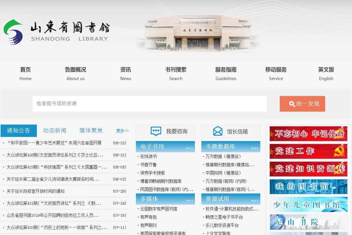山东省图书馆创建于1909年(清宣统元年)。是我国十大图书馆之一,以历史悠久、馆藏宏富而著称。据《山东创建图书馆记》载,山东提学使罗正钧于省城旧贡院东北隙地创建图书馆仿浙江宁波范氏“天一阁”旧制, 院内古木假山,曲水拱桥,极为风雅别致,人称“历下风物,此为最胜”。经过近一个世纪几代人的呕心沥血,艰苦奋斗,辛勤访求,藏书规模日趋宏大,特色日趋鲜明,截至目前形成了具有鲜明特色的系统的藏书体系。其中轻工、医学、哲学等门类的收藏已达研究级水平,而齐鲁方志专藏、海源阁专藏、易经专藏、山东革命文献等收藏为海内翘楚。齐鲁方志海内现存约600种,而本馆馆藏528种,善本58种,《(万历)兖州府志》则为海内孤本。海源阁专藏计2280种32000册,约占海源阁现存藏书的三分之二,并有较多名人手迹,如林则徐、翁同书、吴式芬、钱仪吉、许瀚等人的书札。本馆收藏易经文献1317种,总计2205个版本,近万册。另外,该馆收藏的唐人写经卷、宋刻蝴蝶装《文选》、宋刻巾箱本《万卷菁华》、蒲松龄手稿《聊斋文集》、王士祯批校《昆仑山房集》稿本等均为传世珍品。馆藏期刊涵盖各个学科,基本形成了一个具有特色的综合性馆藏报刊体系。其中辛亥革命时期的山东独立同盟会机关报《齐鲁公报》、原中国共产党渤海区委机关报《渤海日报》、胶东区委机关报《大众报》等资料文献弥足珍贵。馆藏外文书刊则以轻工、化工、电子技术、环境保护、医药卫生方面的文献为特色,如美国《化学文摘》从1907年收藏至今,《日本特许公报》从60年代初收藏至今,还有《美国专利文摘》、《世界专利索引》、《美国工程索引》都具有很高的研究和开发利用价值。山东省图书馆作为国家举办的综合性公共图书馆,是社会主义科学、教育、文化事业的重要组成部分,是向社会公众提供图书借阅和信息咨询服务的学术性机构。他们坚持“一切为了读者”的指导思想,利用丰富的馆藏,通过阅览、外借、课题检索、解答咨询、信息服务、翻译、举办展览、报告讲座等多种形式为读者服务。现有对外服务窗口44个,每周开放73.5小时,办理各种借书证9个,日平均接待读者近五千余人次,并与日本、朝鲜、美国、英国、香港等国家和地区建立了文献交换关系。党的十一届三中全会以来,随着改革开放的深入,图书馆事业的发展进入了快车道。近年来,尤其党的十四届六中全会以来,山东省图书馆坚持“以人为本,读者第一”的服务理念,深化改革,内抓管理,外树形象,打破传统的思维定势,更新观念,统一思想,结合自身的具体实际,确定了建设国内一流图书馆的奋斗目标。推行了一系列的措施,以满足改革开放和时代的需要,推动社会的文明和发展,为两个文明建设服务。新开了畅销书阅览室、电子声像室、国外工艺美术阅览室,电脑图书阅览室、港台资料阅览室及读者书店、咨询服务部等,丰富了图书馆的服务内容,方便了读者,所有这一切服务工作,能够使广大读者高兴而来,满意而去,因而在社会上产生了良好的影响。利用高科技手段,全面推进图书馆现代化。现代社会的科学发展一日千里,高科技手段的普及及应用使图书馆从观念到服务方式都发生了巨大的变化。山东省图书馆以此为契机,广泛利用先进技术,促进图书馆的改革和发展,从而丰富馆藏,简化工作环节,减轻劳动强度,深化服务层次,提高服务质量和水平,使读者能更及时、准确、快捷获取信息。目前,中外文图书书目数据库已建成;网上的馆际互借和学术期刊检索初具规模;采访、编目、流通、报刊、外文、特藏等部门已实现微机管理;利用缩微技术保护珍贵文献也取得可喜成绩……使山东省图书馆向全面现代化迈出了坚实的一步,取得了可喜的成绩。先后荣获“全国文化先进集体”、“读者喜爱的图书馆”、“山东省职业道德建设十佳单位”和省级“精神文明单位”等荣誉称号。 世纪之交,焕发勃勃生机的山东省图书馆挑战和机遇并存,希望与辉煌同在。在省委、省政府、省人大,省政协和文化教育主管部门的关怀和领导下,一个全省文化系统建国以来,最大的投资项目,占地65亩,建筑总面积5万平方米。新馆已建成并于2002年10月正式对外开放。山东省图书馆新馆位于济南高新技术开发区,于1994年动工兴建。整个工程分两期进行,第一期工程综合阅览楼,建筑面积为35830平方米,投资11048.1万元。主体建筑为六层中空式,内部全部采用大开间柱网结构,柱网间距7.2米,每层面积自2000余平方米至6000余平方米不等。建筑采取模数化设计,气势恢宏而结构紧凑,坚实厚重而不失俊雅,它是齐鲁文化的现代象征。二期工程书库楼共12层。新馆适应现代信息化、开放型图书馆的要求,开展多方位、深层次的服务。首先是依靠现代化计算机网络设备,全面实现业务工作及办公自动化。对图书采购、编目借阅、目录信息查询、信息咨询服务实行计算机管理,逐步建立内容丰富、精确高效的馆藏书目数据库、二次文献数据库和全文数据库。其次是在图书馆的管理和服务上完成由封闭型向开放型的转变。对图书报刊文献的借阅全面实行开架管理,开架借阅室由以前的2个增加到8个,开架图书由以前15万册增加到150万册以上。开放各类阅览室、研究室35个以上,读者阅览室座达2000个以上,开展服务的项目大大增加,极大地方便读者,满足各