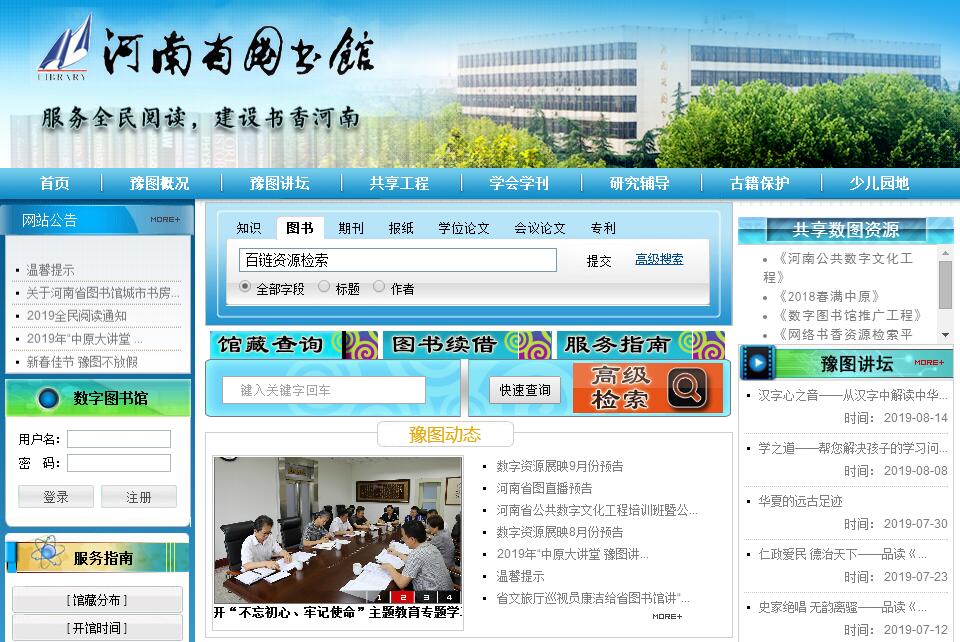 河南省图书馆是我国建馆最早的公共图书馆之一。1908年7月6日,河南提学使孔祥霖呈奏抚院请创建“河南图书馆”,7月13日获准。孔祥霖自任总理(馆长),搜罗大梁、明道书院及学务公所旧藏共计1600种,43000余卷,以开封龙湖南岸二曾祠侧之许公祠为馆址,于1909年2月27(宣统元年农历2月初8日)开馆,定名为“河南图书馆”。1915年,以教育部“图书馆令”改为河南省立图书馆。1928年,奉省政府令改为河南省图书馆。抗日战争期间河南省图书馆迁至南阳、析川等地,1946年迁回开封。1949年3月,河南省图书馆临时归并到中原大学(即河南大学)图书馆,1950年元月,恢复建制,同年10月,改名为“河南省立图书馆”。1953年,又改名为“河南省图书馆”。 1957年5月20日,河南省图书馆由开封迁往省会郑州纬二路省人民委员会礼堂。同年10月在优胜北路建设新馆舍,次年7月建成迁入,建筑面积5000余平方米。1985年在嵩山南路与伊河路交叉口西北选址建设新馆, 1989年建成并交付使用,新馆总建筑面积2.95万平方米。河南省图书馆经历了百年风雨沧桑,几多反复,曲折发展。新中国成立后,特别是改革开放以来,河南省图书馆得到了快速发展,已初步建成为综合性、多功能的现代化图书馆。河南省图书馆始终禀承“读者至上 服务第一”的办馆宗旨,积极开展丰富多彩的读者活动和培训活动。馆内设有17个对外服务窗口,阅览座席1200多个,设有河南省图书馆网站和电子阅览室,年到馆读者达百万人次。还在全省开设30余处外借点,进行图书流通服务。随着远程访问系统的开通,全省各市、县(市、区)图书馆均可共享省馆数字化资源。2002年全国文化信息资源共享工程起步建设,9月建成河南省分中心平台,拥有数字化资源15TB,以IPTV传输、接收模式为主,服务范围覆盖全省4.8万个行政村,形成了基层文化信息资源服务网络。业务窗口实行365天开放。积极开发馆藏资源,先后创办了《港澳台报刊文摘》、《经济文摘》、《决策参考》、《省长专递》等二三次文献。邀请国内、省内著名专家、学者举办“世纪论坛”公益讲座报告会。 2011年5月,河南省图书馆将公益讲座制度化,更名为“豫图讲坛”,在每周周日上午定期举办。截止到2013年底,“豫图讲坛”已连续举办153期。多种延伸服务活动深入开展,公共文化服务能力与水平不断提高。注重自身业务研究和队伍建设,学术成果不断涌现。《河南图书馆学刊》已编辑出版160多期,成为国内图书馆学术交流的重要阵地。从2002年开始,先后编纂出版了“图书馆治学文集”等系列丛书。2009年是河南省图书馆建馆100周年,编纂出版了《河南省图书馆志》、《河南省图书馆百年》、《河南省图书馆同仁文集》、《河南省市、县图书馆古籍善本联合目录》、《河南省图书馆古籍善本书目》、《旧时河南县级图书馆寻踪》、《文献遗产保护技术理论与实践》、《加拿大国家图书档案馆珍藏》等。积极参与文明单位创建活动,先后被上级部门授予“社科联系统先进单位”、“‘三树一讲’活动先进单位”、“社会科学知识普及活动周先进组织单位”、“五好党总支”、“先进基层工会”和“读者喜爱的图书馆”、“郑州市文明单位标兵”等。2004年、2009年两次被文化部评为一级图书馆。2008年3月被国务院公布为全国古籍重点保护单位。2009年,被河南省文化强省建设和文化体制改革工作领导小组评为文化事业发展先进单位。2013年8月,被评为“全国人文社会科学普及基地”和首批 “河南省社会科学普及基地”。截止2013年底,河南省图书馆累计藏书总量达到329多万册(件),其中古籍50万多册。设有借阅部、报刊部、古籍部等10个业务部门,以及综合办公室等5个职能部门。