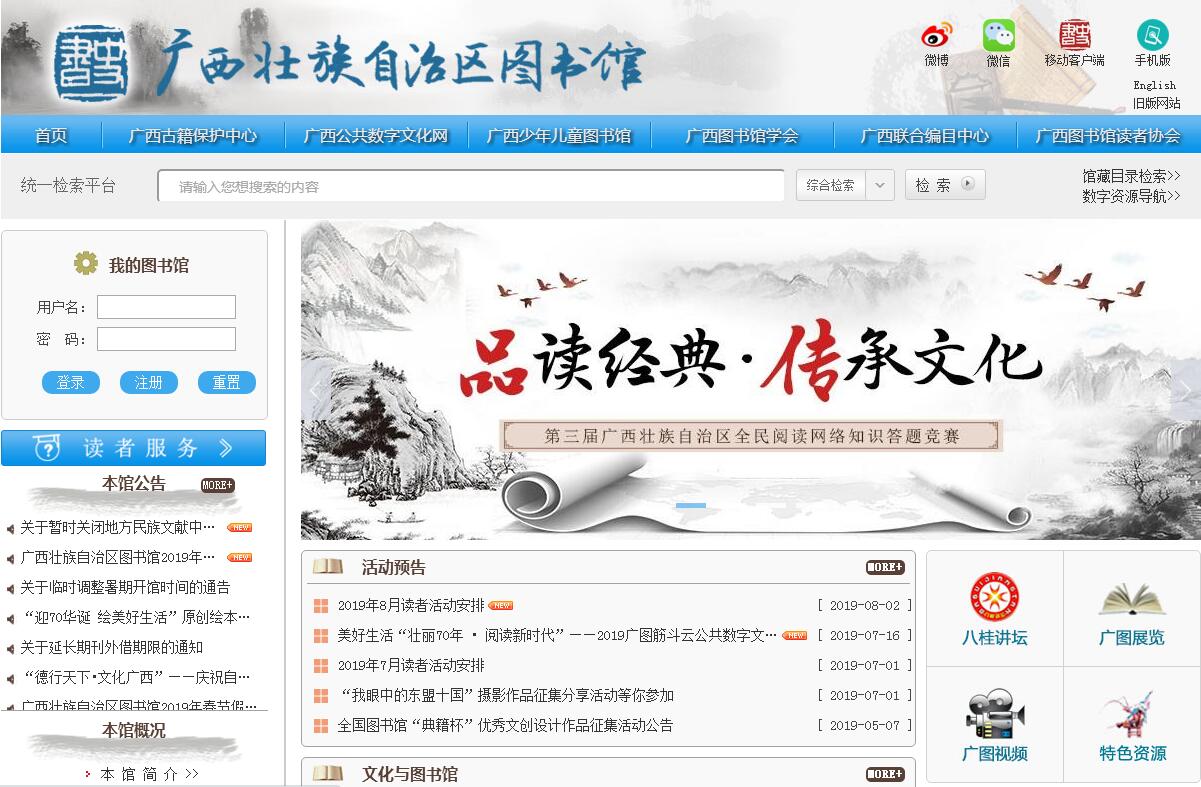 | 网站简介: 广西壮族自治区图书馆(以下简称“广西图书馆”)负责收集、整理、保存文献信息并提供查询、借阅及相关服务,开展社会教育,全年向社会公众免费开放,推动、引导、服务全民阅读。在保障公民基本文化权益,提高公民科学文化素质和社会文明程度,传承人类文明,坚定文化自信上发挥着重要作用。广西图书馆创建于1931年,是广西最大的综合性省级公共图书馆,是全国文化信息资源共享工程广西分中心和广西古籍保护中心,是国家和自治区古籍重点保护单位。截止2018年12月,全馆建筑面积5.4万平方米,分为民族大道主馆和人民公园分馆两部分,设有办公室、人教科、党群工作部、财务科、安全物业管理部、采编中心、借阅部、报刊部、少儿部(少儿分馆)、信息服务部、地方民族文献中心、图书馆科学研究中心、阅读推广部、公共数字文化建设中心、网络技术部等15个部门,另有基建办公室、广西图书馆学会办公室等2个内设部门。全馆设有图书、报刊、音像、电子、少儿等17个借阅室,阅览座位约2000个,可供读者使用的各类电子设备400余台。全馆藏书421万余册,数字资源近212.4TB。 |