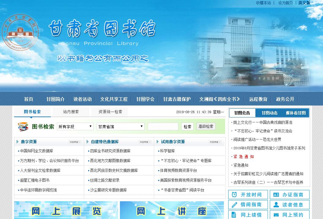 甘肃省图书馆创建于1916年,初名甘肃省公立图书馆(1932年更名甘肃省立图书馆,1942年更名甘肃省立兰州图书馆),1944年,国立西北图书馆(1947年更名国立兰州图书馆)创办,1949年10月两馆合并为兰州人民图书馆,后更名西北人民图书馆,从1953年起始称甘肃省图书馆。甘肃省图书馆迄今已有近百年历史,是向社会公众提供图书阅读和知识咨询服务的学术性机构,国家一级图书馆,国务院公布的首批全国古籍重点保护单位,全国九个地区性中心图书馆之一,也是西北地区的中心图书馆。甘肃省图书馆为省属副地级建制,设有18个业务行政部门,包括采编部、典阅部、报刊部、信息咨询部、历史文献部、研究辅导部、现代技术应用部、文溯阁《四库全书》藏书馆、甘肃省古籍保护中心、全国文化信息资源共享工程甘肃省分中心、继续教育中心、会议展览中心、党委办公室、综合业务处、行政办公室、计财处等。此外,甘肃省中心图书馆委员会、甘肃省图书馆学会、甘肃省《四库全书》研究会、《图书与情报》编辑部、甘肃省图书馆书画研究院均设于馆内。经过近百年的积累,甘肃省图书馆的藏书总量已逾460万册,其中以古旧籍和西北地方文献为特色馆藏。古旧籍藏书38万册,包括享誉海内外的文溯阁《四库全书》、宋元刻本、大型明版木刻丛书《永乐南藏》,以及敦煌写经、名人手札、珍贵字画等;西北地方文献收藏已逾12万余册,使甘肃省图书馆逐步成为研究西北史地、民族宗教以及敦煌学、丝路学的文献中心。伴随着实现业务管理自动化的步伐,馆藏资源数字化逐步推进,数字资源不断充实,形成多种载体类型互补的文献保障体系,已订购以及中国知网(CNKI)期刊全文数据库、报刊复印资料全文数据库、全国报刊索引、万方数据知识资源系统、博看期刊数据库、台湾经典人文期刊库、新东方多媒体学习库、超星电子图书等30个各类商业数据库,并自建有《西北地方文献资源数据库》《沙尘暴研究专题数据库》《四库全书研究专题资源库》《甘肃地方戏曲专题资源库》《甘肃省图书馆周末名家讲坛专题资源库》等20多个特色资源数据库。甘肃省图书馆全年365天全免费开放,馆内百万余册开架图书、5000余种期刊、260余种报纸,以及各类多媒体资料、缩微文献和网络数字资源等,向读者提供多层次的内阅外借、检索咨询、课题跟踪等服务。持证读者达13万余人,年接待读者160多万人次,流通书刊1000多万册次。馆内设有办证处、咨询处、检索厅、外借处、阅览室等服务窗口18个,报告厅、展览厅、会议室等基础设施齐全,并通过遍及全省城乡的70个分馆和图书流通站、1.6万个共享工程各级基层中心和服务点,图书馆的服务还在不断延伸。周末名家讲坛、甘肃省残疾人阅览服务中心、甘肃省流动儿童阅读中心、农民工之家、图书流动车、24小时自助图书馆是甘肃省图书馆近年来推出的主要服务品牌。近年来,甘肃省图书馆获得诸多荣誉,多次被评为国家、省、市级文明图书馆,文化工作先进集体等。2007年,获文化部首次颁发的“群星奖——公共图书馆服务奖”,2009年被中国图书馆学会授予“全民阅读基地”称号;2010年,被文化部评为国家“一级图书馆”;2011年,被省委文化体制改革工作领导小组评为“全省文化体制改革先进单位”;2012年,“工地图书流通站”项目获得文化部“农民工文化服务示范项目”称号,“志愿者行动——基层图书馆员培训活动”荣获文化部全国基层文化志愿服务活动优秀项目称号,被省委宣传部等部门授予“全省文化体制改革先进单位”;2013年,再次被文化部评为国家“一级图书馆”,被甘肃省妇联授予“甘肃省三八红旗先进集体”,“残疾人阅读中心”被省文化厅评为效能风暴行动“创新服务窗口”;2014年,被甘肃省人民政府残疾人工作委员会被授予 “全省助残先进单位”,被文化部授予“全国古籍保护先进单位”,被甘肃省信息协会授予“甘肃省信息化先进单位”;2015年,被全国妇联授予“全国巾帼文明岗”称号,被省妇联授予甘肃省“三八红旗集体”;2016年,被省文化厅授予省直文化系统“先进集体”称号;2017年被省政府农民工工作领导小组办公室授予“全省农民工工作先进集体”称号。