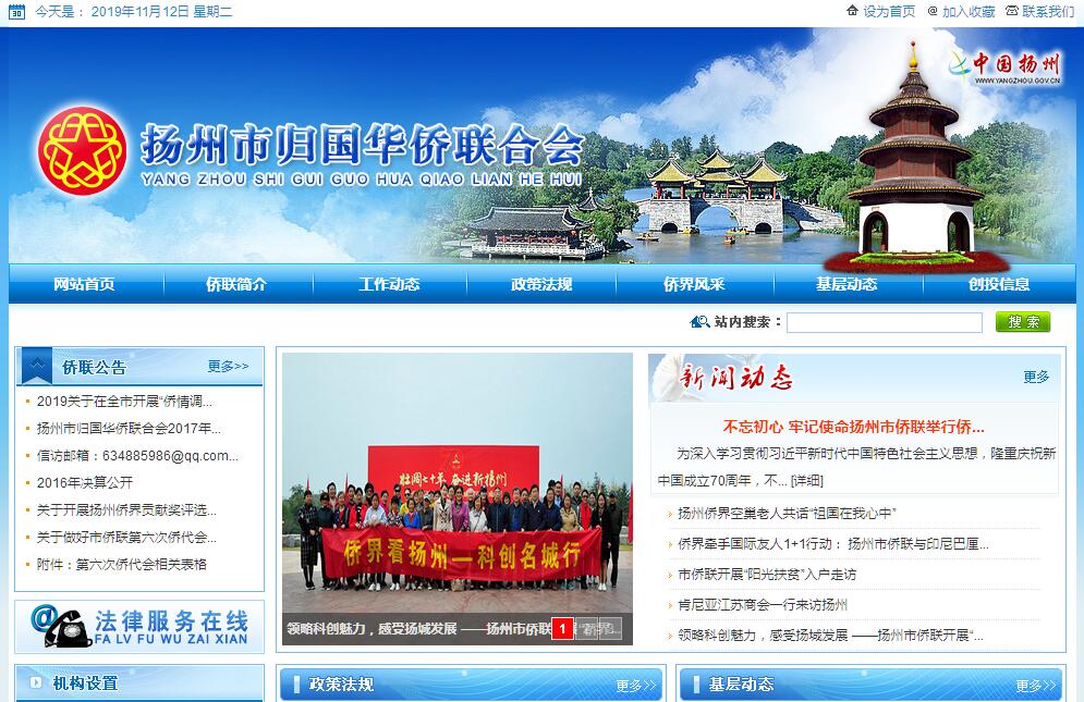 扬州市归国华侨联合会(简称扬州市侨联),是扬州市委领导的由归侨侨眷组成的人民团体,是党和政府联系广大归侨、侨眷和海外侨胞的侨梁和纽带。扬州市侨联代表归侨、侨眷的利益,关心海外侨胞的正当权利和利益。扬州市侨联是扬州市政协的组成单位,是江苏省侨联的团体会员。全市共有县(市、区)各级基层侨联组织30个。驻扬单位、高校侨联组织为扬州市侨联的团体会员。2000年3月,扬州市侨联新华侨工作联谊会的成立,为扬州市侨联的新华侨工作注入了新的力量和活力。扬州市侨联实行民主集中制,其领导机关是全市归侨、侨眷代表大会及其选举产生的委员会。扬州市侨联第六届委员会委员35名,常委13名,海外顾问100名。主席杨为民(女)、副主席周军、高志刚(兼)、魏全林(兼),王修文(兼)。秘书长周军(兼)。扬州市拥有海内外华侨华人和归侨侨眷10万人。扬州市侨联与30多个国家和地区的80多个华侨华人社团保持着广泛的联系。通过友好交往,与我市经济贸易、科技、文化、教育等领域建立了友好合作关系,为推动我市经济和社会事业的发展作出了贡献。扬州市侨联会址在江苏省扬州市文昌中路134号市政府东大院内。办事机构有办公室、宣传联络部。浩荡万里的长江和古老的运河交汇处,有一座风光秀丽,历史悠久,文化和经济发达的名城。这就是扬州。扬州是国务院首批公布的全国二十四座历史文化名城之一。丰厚的历史文化遗存,众多的文物古迹,综合着中华民族文化的方方面面。作为江苏省的第二大侨乡,早在1250多年前,唐代扬州大明寺住持鉴真东渡扶桑,成为扬州历史上最早旅居外国的侨民,为发展两国的文化交流和增进两国人民的传统友谊作出了重要贡献。扬州的经济和文化几度兴旺繁荣。早在唐代,“江淮之间,广陵大镇,富甲天下”,扬州就吸引了数以千计的波斯、阿拉伯、日本、高丽等国的商人,成为著名的“海上丝绸之路”的东方四大商港之一;从唐宋到明清,扬州的文化艺术经久不息,从欧阳修、苏东坡到王士慎、汪渔洋,从石涛到“扬州八怪”,从鉴真到普哈丁,无论是诗文、书画,还是经史、宗教,或是园林、烹饪、盆景、琴艺,扬州几乎在文化的所有领域和各个层次都自成体系,独树一帜,至今仍然有着广泛而深远的影响。扬州,还是江泽民同志的故乡。今日扬州,有着北方之雄、南方之秀的园林风光,传统行业与新兴产业交相辉映,社会事业发达。目前,扬州全区面积6万多平方公里,人口480多万,形成了机械、轻纺、食品、电子、化工、汽车等支柱行业和工艺美术的特色行业,并与100多个国家和地区开展了各种形式的合作与交流。由几所高校合并组建的扬州大学设有二十四座学院,是全国仅次于浙江大学的,全科门类最齐全的大学,在校生20000多名,现正朝着名学府的目标迈进。扬州城也正朝着“旅游城”“大学城”“汽车城”的方向大步发展。扬州以古典园林著称,偈是一本书、一部电视连续剧,需慢慢读,慢慢体会。到扬州可以领略古运河风采,欣赏私家园林,品尝中国四大名菜之一的淮扬菜,感受沐浴文化,收藏传统工艺,品味地方曲艺。目前扬州已获得“国家环保模范城市”“全国生态建设示范市”“国家卫生城市”“全国文明城市工作先进城市”“国家园林城市”和江苏省唯一“人居环境奖”。也是全国地级市中第一个通过人居环境卫生规划的城市。在改革开放的新时期,扬州市侨联紧紧围绕“为经济建设服务”这个中心,积极开展各项宣传联络和牵线搭桥工作,同时继续为海外侨胞和各界朋友挥桥梁纽带作用,广交新朋友,不忘老朋友,并热忱欢迎各界侨胞和友人光临扬州,共谋发展,携手为扬州实现两个率先,力争苏中第一作出贡献。