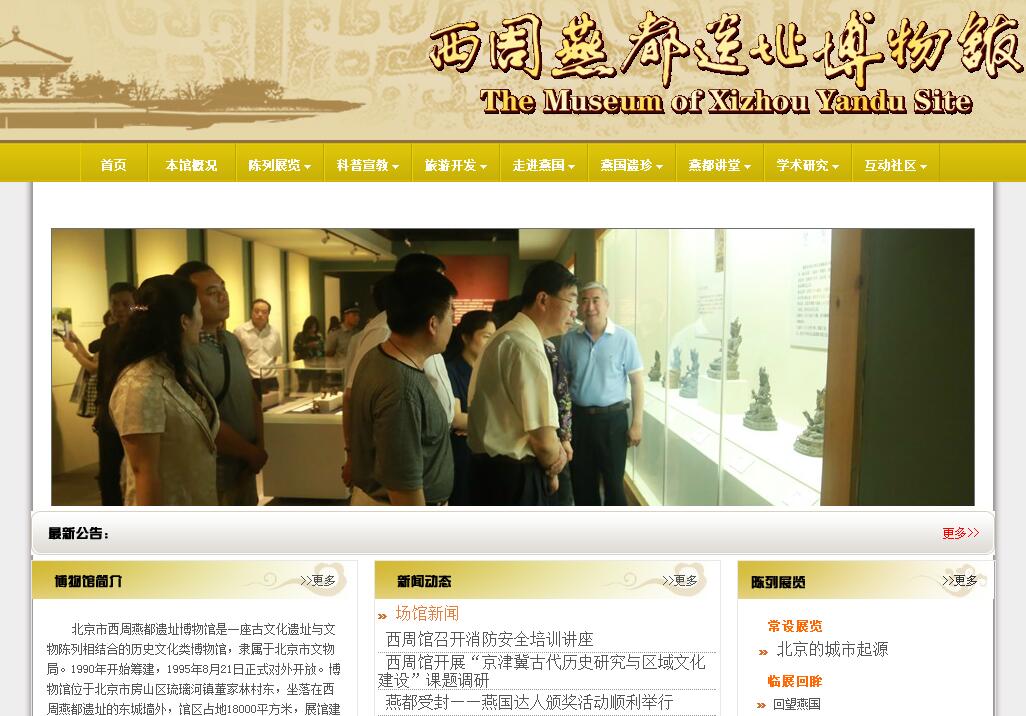 北京市西周燕都遗址博物馆是一座古文化遗址与文物陈列相结合的历史文化类博物馆,隶属于北京市文物局。1990年开始筹建,1995年8月21日正式对外开放。博物馆位于北京市房山区琉璃河镇董家林村东,坐落在西周燕都遗址的东城墙外,馆区占地18000平方米,展馆建筑面积3000平方米。展出文物数百件,有青铜器、陶瓷器、玉石器、漆木器和甲骨等,尤以四座原址保留的墓葬和车马坑为特色。车粼粼马萧萧,让我们搭乘这驾跨越时空的马车,去感受3000多年前的古城风貌。西周燕都遗址,因其发现地被称为琉璃河遗址。遗址位于北京市房山区琉璃河镇东北2.5公里处,包括董家林、刘李店、黄土坡、洄城、立教、庄头六个自然村,东西长3.5公里,南北宽1.5公里,面积为5.25平方公里。琉璃河遗址是迄今西周考古中发现的唯一一处城址、宫殿区和诸侯墓地同时并存的遗址,出土的大量带“匽侯”铭文的器物,证明了这里就是三千多年前燕国的都城所在地。1997年,“九五”国家重点科技项目“夏商周断代工程”特设了“琉璃河西周燕都遗址分期与年代测定”的专题。遗址于1979年列为北京市文物保护单位,1988年被国务院颁布为第三批国家重点文物保护单位,并被列入“二十世纪中国100项考古大发现”,具有很高的历史和科学价值。博物馆为方形建筑,建筑风格采取对称四合院式布局,中心以文献记载之周“明堂”特点为主体,用五组(一高四低)四角攒尖式大屋顶覆盖,顶为棕红色色调;外形作“五室”、“重屋”、“四旁”等,四周展室为单层,用平顶、出瓦檐的形式,使外形取得廊庑及围墙效果,以衬托中心主体。按照周代制度在序厅对面设屏风式影壁一座,上嵌大理石石面,雕刻有苏秉琦先生题写的馆名;在大门入口处设石柱斗拱,配以用饕餮、夔龙等纹饰为题材的浮雕饰物,起“符号”作用。整座博物馆气势宏伟,格调典雅庄重,整体氛围强烈感人。1995年,馆内陈列为《灿烂的古燕都文化》,通过大量的出土器物和墓葬车马坑等遗存勾勒出燕国古都的繁荣景象。2007年9月,我馆进行展厅改造和重新布展。新展陈《北京的城市起源》,以燕都古城和墓葬区的展示为中心,向前追溯北京城市的文化起源,向后诠释出燕都对燕国八百年风云走向以至北京城市发展的深远影响。北京正是从原始聚落到方国都邑再到全国首都这样一步步走来,最终得以昂首屹立在于世界东方。展陈吸纳了学界最新的学术研究成果,并采用了幻影成像等多媒体展示手段,整个展览分为北京古史文化、西周燕都古城、燕都贵族墓葬、燕都精美文物、燕国五都变迁等五个部分,展示了造型精美的青铜器、玉器、陶器、原始瓷器、玛瑙、漆器、甲骨等艺术珍品,再现了古燕国三千年沧桑的都城城垣、神秘奢靡的贵族墓葬。推出了适应广大社会群体的“中国古代科技史”科普系列临展和巡展。已经完成《铜造就的文明》、《承载历史的车马》、《走近先秦农业》及《北京城与中国古代都城展览》等科普临展。这些展览都已经在周边学校和社区展出,得到师生和居民的一致好评。2011年序厅和临时展厅局部改陈。开展社会教育及对外宣传是我们工作中的重要一项。我馆作为爱国主义教育基地、科普基地、青少年社会大课堂资源单位及校外教育基地,多年来始终坚持“以史育人、科教育人”的办馆宗旨。在认真履行工作职能的同时,我们又充分发挥青教育基地优势,开拓创新,重点突出,有针对性的开展了大量的互动项目,深受学校、学生的拥护。实现了博物馆功能与科普职能相互促进的良性循环。每年我馆都与周边附近的多所学校开展不同形式的宣传活动,由于有些活动设计新颖合理,深受学校的欢迎,所以我们已把此类活动做为我们的品牌项目,长期推广到学校中去。如:“西周馆志愿义务讲解员”活动,就已经成功举办了七年,每年都有不同学校、不同年龄的学生参与此项活动,收益非浅;“考古兴趣小组”在燕化星城中学现已成立五年,累计吸收组员达160人。2008年以奥运工作为重点完善了馆内服务设施:如:完善双语标识、语音导览机、无障碍盲道。为营造一个良好的旅游参观环境,利用自由资金对博物馆的影壁墙、传达室、警卫室进行了粉刷和维修。完成了雨水砖铺设工程。对停车场路面进行了整理及停车位的规划,为游客参观提供了方便。积极推进博物馆环境建设和整治,对博物馆周边环境进行了清理、整顿,合理布置院内绿化地,改造和新种花草、树木1000棵,同时,设置了休息椅为游客提供了良好的休息环境。