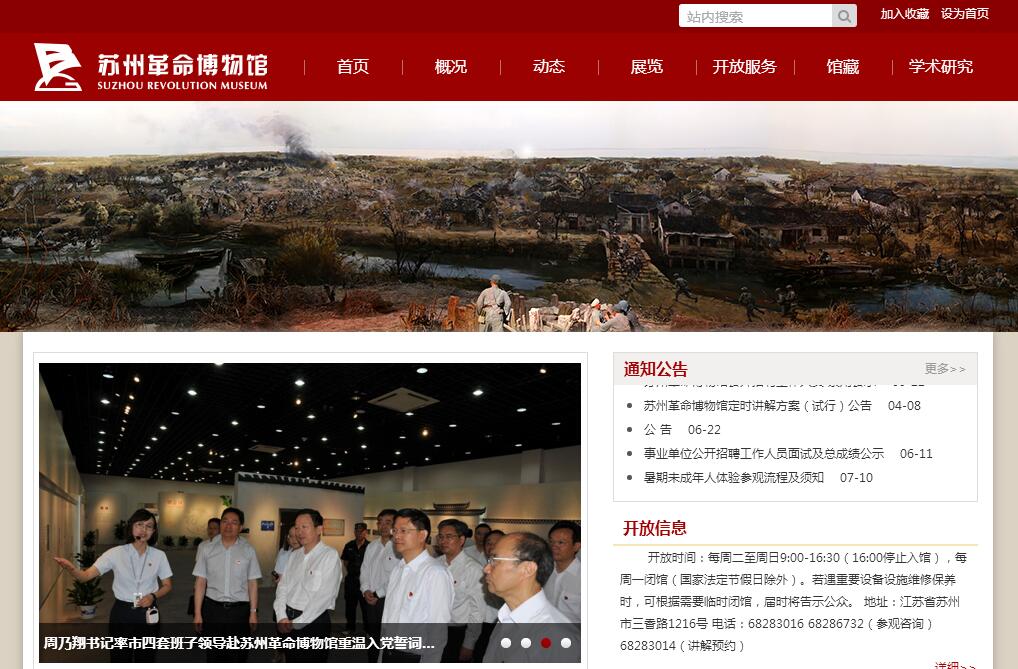| 网站简介: 苏州革命博物馆建成于1993年,占地10000多平方米,展区分两层,面积4000平方米,共有两项基本陈列和两个临时展厅。整体建筑具有鲜明的革命纪念主题特色和浓厚的历史文化气息。基本陈列《光辉的历程——中国共产党在苏州》,通过3个展厅的介绍,借助历史照片、文字和革命文物等,系统讲述了在中国共产党的领导下,苏州人民走过的90多年革命、建设和改革开放的光辉历史。大型多媒体半景画演示项目《阳澄烽火》,借助声、光、电等多种演示手段与1000平方米的巨型油画、500平方米的场景模型完美结合,细致还原了发生在抗日战争时期阳澄湖地区的“洋沟溇战斗”。苏州革命博物馆是省爱国主义教育基地、省社会科学普及示范基地、省国防教育基地和省青少年科技教育示范基地,为2013-2015江苏省文明单位。2008年5月起,所有展示项目均免费开放。 |