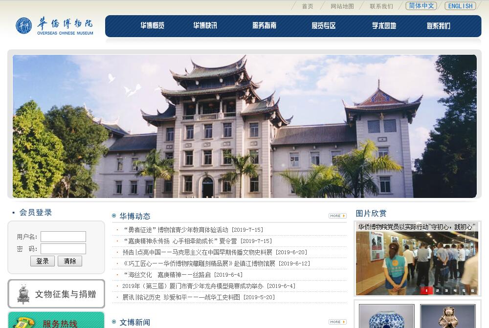 风景如画的海滨城市厦门地处我国东南沿海,是历史上华侨出入国的主要口岸。华侨博物院就坐落在市区的五老峰下,毗邻厦门大学和南普陀寺。华侨博物院是著名华侨领袖陈嘉庚先生于1956年倡办,1959年落成开放的,是由华侨集资兴建的文博机构,是全面、系统展示华侨华人历史的综合性博物馆。馆舍是一座富有浓郁中国民族风格的重檐式宫殿建筑,楼身由洁白花岗岩砌成,屋檐以翠绿琉璃瓦铺饰,斗拱玲珑,飞檐凌空,古色古香,雄伟壮观。全院占地面积12000 平方米,建筑面积10110平方米;馆藏文物近7000件,包括历代青铜器、陶瓷器、古钱币、古字画、古代雕刻工艺品、外国陶瓷玻璃器皿,以及一批珍贵的侨史文物和鸟类、兽类、鱼类、矿物标本等,其中有多件国家一级文物。2005年推出的《华侨华人》、《陈嘉庚珍藏文物展》、《自然馆》三个基本陈列常年对外展出。《华侨华人》以院藏侨史文物资料和侨史研究新成果为基础,借助新的展示手段,形象、系统地向人们回顾了华侨华人走出国门、走向世界的足迹;再现了他们在居住国的生存状态和杰出表现;介绍了他们从侨民到公民认同转变的过程;讴歌了他们为人类进步事业创下的不可磨灭的功绩;展示了华侨对祖国的拳拳赤子心和殷殷报国情。该陈列所涉及的侨乡、侨居国均不受地域限制,展示面广,时间跨度大,于2005年5月荣获国家文物局、中国博物馆学会、中国文物报社颁发的第六届全国博物馆十大陈列展览精品评选最佳新技术、新材料运用奖。《陈嘉庚珍藏文物展》展示了从陈嘉庚先生于耄耋之年亲往北京等地征集的文物中选取的部分青铜器、陶瓷器、字画等,让观众通过品赏神秘的青铜器、精美的陶瓷器、风格迥异的字画等饱含先民智慧和心血结晶的艺术珍品,从而了解博大精深、悠久灿烂的中华历史文化,感受创办这座文化殿堂的陈嘉庚先生的博大的胸襟和伟大的教育思想。《自然馆》设置了模拟的自然生态环境,150多件鸟类、兽类等自然标本散落在适宜它们生存的环境中,形象生动、呼之欲出。展览在向观众展示动物的多样性、宣传科学知识的同时,呼吁人们提高保护野生动物、保护环境的意识。2008年6月18日,华侨博物院举行隆重的“国家一级博物馆”揭牌仪式,市委常委、统战部部长欧阳建、市文化局局长罗才福及我省近20家博物馆的馆长等领导和来宾参加了揭牌仪式。市委常委、统战部部长欧阳建、市文化局局长罗才福分别讲话祝贺华侨博物院荣膺“国家一级博物馆”。本次博物馆评估定级工作,是建国以来国家文物局首次组织进行的,首批“国家一级博物馆”全国共评出83家,福建省有5家入选,依次为福建博物院、华侨博物院、中国闽台缘博物馆、泉州海外交通史博物馆和古田会议纪念馆。五十多年来, 华侨博物院接待了海内外观众160多万人次,在传播历史和科学知识,进行爱国主义教育,增进中外人民的了解和友谊,推动中外文化交流等方面,发挥着独特的作用,产生了积极的影响。现为全国、省、市和全国侨联爱国主义教育基地。