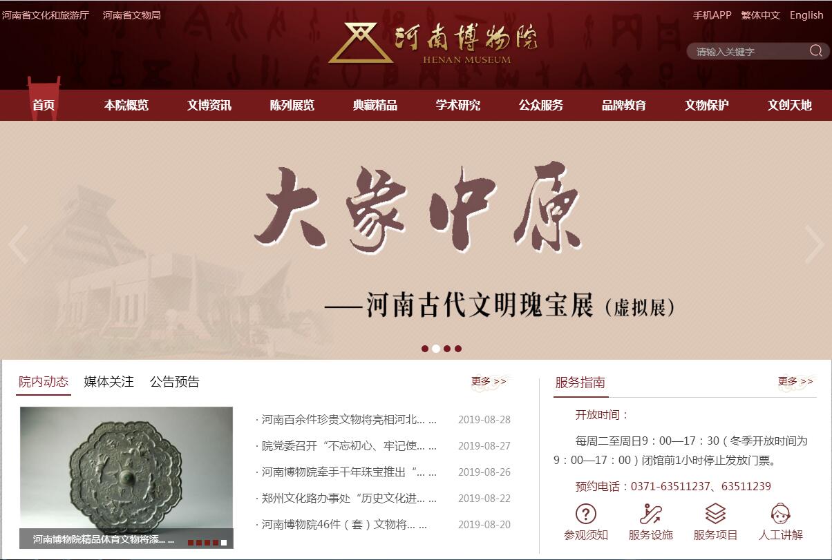 | 网站简介: 河南博物院1927年创建于开封,1961年随省会迁至郑州,1994年新馆开工建设,1998年5月1日正式对外开放。院区占地面积126亩,建筑面积5.5万平方米,建筑群取“九鼎定中原”之寓意,体现中原文化源远流长、博大精深的特征。2009年入选首批中央地方共建国家级博物馆 。河南博物院现有藏品17万余件/套,大多数为珍贵文物,其中以青铜器、玉石器、陶瓷器、石刻造像等最具特色,是见证和展示 华夏文明起源形成与发展脉络的文化艺术殿堂 。原开放有基本陈列“中原古代文明之光”,专题陈列“河南古代石刻艺术馆”“河南古代玉器馆”“楚国青铜艺术馆”“明清工艺珍宝馆”等。现主展馆闭馆进行功能提升,于西配楼推出“大象中原——河南古代文明瑰宝展” 等临时展览。河南博物院以“发扬固有文化、提倡学术研究、增长民众知识、促进社会文明”为建院宗旨,以建设“国内领先、世界 一流”博物馆为目标,不断提高公共文化服务水平,精心打造公益文化服务品牌,是领略中原文化魅力的重要窗口,增进文化交流合作的重要桥梁 。 |
