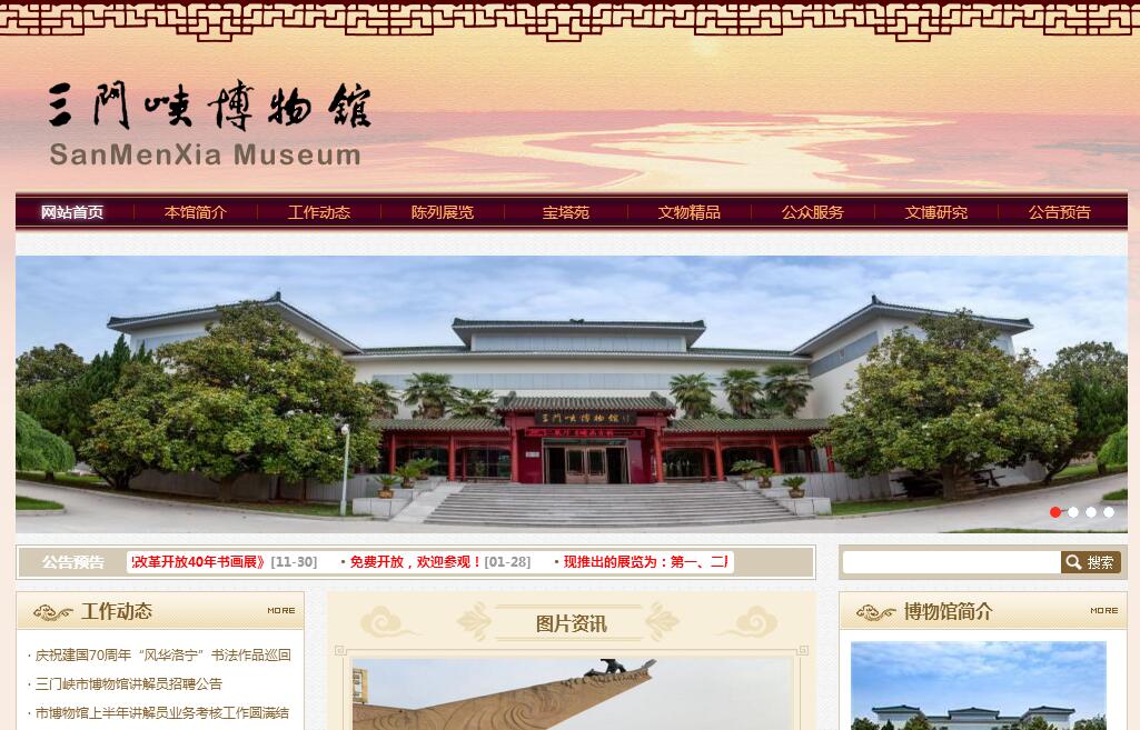 三门峡市博物馆位于河南省文物保护单位——陕州故城遗址区,二十世纪八十年代该遗址区被辟为陕州公园。这里山水一色,素有“四面云山三面水,一城烟树半城田”之美誉。馆区坐落在唐代孔庙遗址上,占地19800平方米,建筑面积9800平方米,展厅面积4400平方米。仿古园林式建筑风格独具特色,典雅秀丽,可谓“馆中有园,园中有馆”。馆藏文物15000余件(套),其中三级以上国家珍贵文物1400余件(套),是一座集文物收藏、陈列展示、科学研究、社会教育与文化交流诸功能为一体的综合性博物馆。现为国家二级博物馆,国家文物二级风险防范单位,河南省爱国主义教育示范基地,全国第一批面向社会永久免费开放博物馆。如果您想了解三门峡的悠久历史和灿烂文化,不需要遍访10496平方公里的崤函大地,《崤函古韵——三门峡古代文明展》就能为您解惑释疑,帮您找到答案。它按照历史发展脉络,分为“人文初启”、“古国觅踪”、“崤函风雨”、“名州望郡”、“襟带两京”及“陕虢遗风”六个部分,从不同层面生动再现了三门峡历史发展演变轨迹。质朴自然的展览装饰、简洁明快的表现手法,与一件件古拙精美的文物融为一体,营造出一个古朴、典雅、和谐的展示氛围,使您在信步穿越历史时空的旅程中,心灵受到触动,精神得到升华。同时,不定期推出的一系列主题鲜明的临时性展览,内容丰富的社教活动等,也是对综合性博物馆职能的完善和补充。至此,如果您有些许收获,我们将荣幸之至,这也是博物馆人的初衷和期冀!