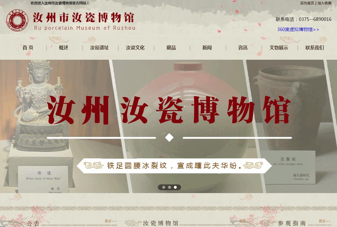 汝瓷博物馆筹建于1983年,1985年12月开馆,位于汝州市望嵩路65号,设在全国重点文物保护单位----汝州文庙院内。博物馆总占地面积6400平方米,建筑面积2500平方米,展厅占地面积约2000平方,是目前国内唯一的一家以汝瓷为主题的专业性博物馆,主要负责文物收藏、陈列、研究、科普宣传、教育。馆内藏品丰富、史料充实,三级以上馆藏文物近2000件,展厅内包括石器、陶器、瓷器、青铜器、名家书法、碑廊石刻等,全方位多角度地展示了汝州悠久的历史积淀和深厚的文化底蕴。目前馆内有多功能展厅8个。陶瓷文物精品展厅,展示汝州市出土的重要的精美的陶瓷文物。瓷片标准展厅,布置两个展览内容,第一部分是在汝州市出土的宋、元时期各重要瓷器烧制窑口的瓷片标本及部分瓷器烧制工具;第二部分是建国以来,汝州市几代陶瓷工作者恢复汝窑生产过程中各时期典型代表器物。宋室鸿宝汝贴展厅,布置《汝贴》石刻及拓片。18种汝官瓷仿制品展厅,布置18件由汝州市陶瓷艺人仿烧的汝官瓷作品。代表性非遗项目‘’汝瓷烧制技艺”传承人展厅,布置汝州市2位国家级传承人、5位省级传承人和汝瓷邮票四件套原型汝瓷作品。首届中国陶瓷成型技能竞赛捐赠作品展厅。布置2015年我市承办的首届陶瓷成型职业技能竞赛。(河南赛区)中捐赠的优秀作品。首届中国(国际)汝瓷文化节历史名窑作品展厅,布置汝窑、钧窑、耀州窑、礠州窑、越窑、定窑、德化窑、景德镇等八大历史名窑经典作品。汝州市打击文物犯罪活动成果展。近年来,汝州市博物馆先后获得河南省大中小学生德育教育基地、爱国主义教育基地、河南省特色文化基地、河南省科普教育基地、党风廉政教育基地、青年文明号、中国华侨国际文化交流基地等称号,常年以来,博物馆坚持免费开放,特别注重教育功能的发挥,年接待国内外专家、学者、社会团体及学生30万于人,近期开展“博物馆·学校”直通车教育活动。在社会引起广泛关注和好评,大大提高了汝瓷博物馆的社会影响力。
