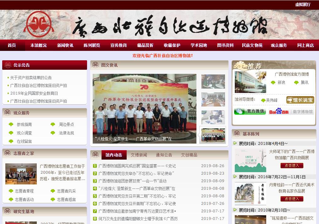 广西壮族自治区博物馆(以下简称广西博物馆)是省(自治区)级综合性历史、艺术类博物馆,也是全国首批国家一级博物馆。馆藏文物(含古籍)7万多件(套),时间跨度长达80多万年。广西博物馆地处南宁市政治、文化、商业中心,占地面积4万多平方米。陈列大楼之外还建有颇具民族特色的文物苑,是国内最早开创 “馆苑结合”、“动静相辅”模式的博物馆。广西博物馆是展示和传承八桂历史文明、弘扬优秀传统文化的艺术殿堂,已构建了基本陈列、特别展览、合作展览、输出展览和引进展览交相辉映的陈列展览体系,且不断探索改革、推陈出新,全力讲好广西故事。西博物馆近年来不断探索多元化宣传教育模式,开展了一系列独具亮点的社会教育活动,充分发挥博物馆的公共文化服务作用。广西博物馆紧紧围绕“以人为本”中心思想,通过免费讲解、主题导览等形式,使展览不断贴近群众。在馆外,广西博物馆文物宣传小分队开展流动展览进社区、进校园、进军营等活动,与社会各界广泛开展文化共建,设立文化服务点,让更多的公众了解广西历史文化,使博物馆融入到广大公众的日常生活中。为了吸引更多的未成年人走进博物馆,广西博物馆以爱国主义教育为主线,把博物馆社会教育开展得有声有色。根据未成年人的特点,广西博物馆举办通俗易懂的专题讲座,制作了符合孩子特点的教育宣传折页,开展具有特色的教育互动活动,如“中华传统节日主题活动”中的特色手工活动、“暑期欢乐营”中的博物馆文化体验课堂等。据不完全统计,广西博物馆每年开展公众活动400余次。随着社会影响日益扩大,广西博物馆的活动形式也在不断推陈出新,活动品质不断提升,为观众打造了高品质的文化盛宴。2014年新春,广西博物馆的“汉服体验秀”活动在中央电视台《新闻联播》节目中报道;“古风国韵音乐会”、传统手工艺课堂等活动也在观众中引起了巨大共鸣,反响热烈。广西博物馆注重为特殊群体组织专题活动,通过爱心展览、爱心课堂、爱心图书角、爱心体验以及爱心帮扶等形式,积极关爱孤儿、清洁工、留守儿童、聋哑儿童、贫困学生、农民工子女等。此外,广西博物馆还积极创新志愿服务的工作机制,扩大志愿者队伍规模,拓展志愿服务领域,志愿者工作蓬勃发展。为扩大宣传力度,延伸为民服务功能,广西博物馆不断尝试,将新媒体技术运用到宣传推广上。建立新浪、腾迅、人民网三个官方微博;开通广西博物馆官方微信平台;采用网络直播的形式,对现场活动进行了实时报道;联合“新浪广西”在微博上开展微直播和微访谈,在官方微博上对活动进行直播报道;针对大型展览,开发各种APP应用程序等。通过不懈努力,广西博物馆人性化、个性化的服务,使得博物馆文化在公众面前变得越来越触手可及。丰富多彩的社会教育活动,使博物馆“活”了起来,让更多的人走进博物馆并爱上博物馆。为有效服务国家“一带一路”战略的实施和中南西南战略支点的打造,加快广西文化大发展大繁荣和民族文化强区建设,提升广西对外开放和现代公共服务水平,广西博物馆近几年重点筹备改扩建项目。改扩建后的广西博物馆将继续集收藏、保护、研究、展示、教育于一体,依托中国—东盟自由贸易区的中心区位优势,着力打造成为国际文化交流平台,国家重要文化阵地,广西首府文化建筑的新地标,南宁特色文化旅游的新景点。场馆建设依然沿用“馆苑结合”、“动静相辅”的模式,馆内可游可居、可玩可歇、可吃可购、可交流可学习,成为更好地服务社会、服务大众的公共文化服务中心。