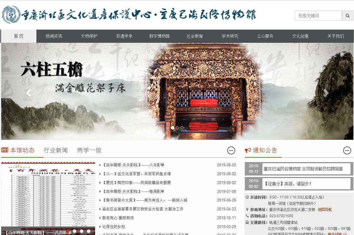 | 网站简介: 重庆市渝北区文化遗产保护中心,加挂重庆巴渝民俗博物馆,位于渝北区双龙大道二支巷碧津公园内,是为适应文化遗产保护发展需要,于2016年在原区文物管理所基础上成立的集文物保护、非遗传承与博物馆免费开放为一体的文化遗产保护、研究与宣传教育机构。中心以保护利用文化遗产、弘扬民族文化为宗旨,依法承担全区文物保护管理、文物研究利用、非物质文化遗产收集整理与保护、文化遗产保护相关业务培训等职责。重庆巴渝民俗博物馆,建立于1994年,为国家三级博物馆,面向社会免费开放。2015年改陈后设有民俗馆和古床馆,民俗馆以“民俗”为主题,展示传统农耕生产、物质生活、婚俗礼仪和民间信仰等巴渝民俗事项;古床馆在博物馆婚礼院的基础上改建而成,以“古床”为主题,展示清代中晚期至民国时期巴渝地区各式特色古床等精品木雕家具。重庆巴渝民俗博物馆以精致的展览和浓厚的地域文化特色,成为展示渝北形象、宣传巴渝文化的重要窗口。 |