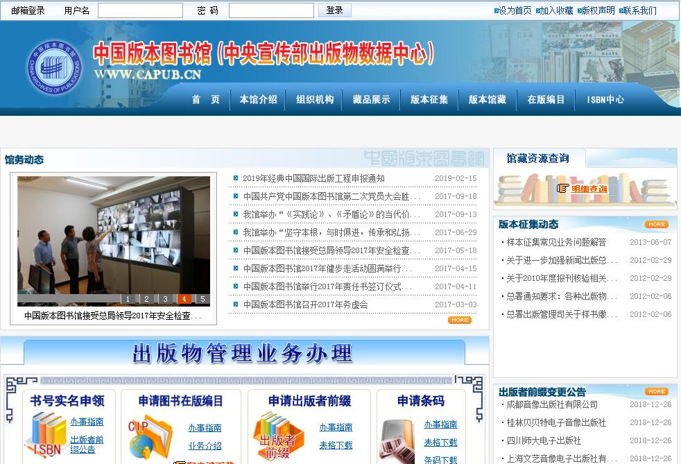 中国版本图书馆的前身为中央人民政府出版总署图书馆,成立于1950年7月1日,由中央人民政府出版总署署长胡愈之提议并创建。其任务是:负责保管中国出版物样本,以利于出版工作的调查研究和文化的传承。成立伊始,立即向全国国营、公私合营、私营出版单位征集1949年10月1日后印行的初版、重版图书和期刊样本,并接收了原南京国立编译馆的全部藏书,成为最早的馆藏。1987年1月,中华人民共和国新闻出版署成立,中国版本图书馆为其直属事业单位。1995年10月,中国版本图书馆与新闻出版署信息中心合并,称新闻出版署信息中心(中国版本图书馆)。其主要职能是:征集、保管全国各级各类出版物样本,收集整理和开发利用图书、报刊、音像制品、电子出版物以及版权、发行等信息资源,建立新闻出版行业信息基地和网络,为领导机关、新闻出版行业和全社会服务。中国版本图书馆馆藏宏富,至今为止,中国版本图书馆共收藏各类出版物版本410多万种,其中图书360多万种,期刊合订本29.4万本,报纸合订本7.3万本,音像制品、电子出版物20万种,老宣传画18万张。中国版本图书馆征集的出版物品种最多、版本最全、整体记录最完整,除了普通的图书、报纸、期刊、音像及电子出版物以外,还征集到了各种图片、卷轴、连环画、年历、挂历、明信片、碑贴、拓片、乐谱、歌片、地图、教学挂图、技术标准、盲人读物等。2010年5月,新闻出版总署根据我国文化事业大发展大繁荣以及新闻出版业改革创新、向新闻出版强国迈进的总体要求,调整了部分署直事业单位的机构和职能,恢复中国版本图书馆的建制,加挂新闻出版总署条码中心的牌子,更名为中国版本图书馆(新闻出版总署条码中心),首次将书号实名申领、条码制作、图书在版编目、馆藏样书编目和样书收藏管理等业务整合到中国版本图书馆,形成了一个从印前信息一直到样书管理的完整的工作链。新闻出版总署明确了中国版本图书馆的主要职能:履行全国正式出版物征集典藏职责;负责总署委托的全国出版单位出版的图书、音像和电子出版物样书(本)的接收与实物管理;实施版本文化资源保护工程,负责版本文化资源的整理、发掘、抢救与保护;负责《中国标准书号》、《中国标准书号条码》、《中国标准连续出版物号》、《中国标准刊号条码》和《图书在版编目数据》等出版物标识标准的贯彻与实施,指导和监督出版物标识的规范使用,负责与相关国际组织的交流与合作(中国ISBN中心主任由馆长兼任);负责全国出版者号(含公共出版者号)和出版者档案的登记与管理;承担全国出版单位书号实名申领的相关工作,负责相关信息系统建设和技术维护,编制发放中国标准书号、出版物条码、图书在版编目数据核字号等;负责出版物元数据库、图书在版编目数据库、版本征集馆藏数据库的建设与管理,提供相关的技术咨询与公共信息服务。