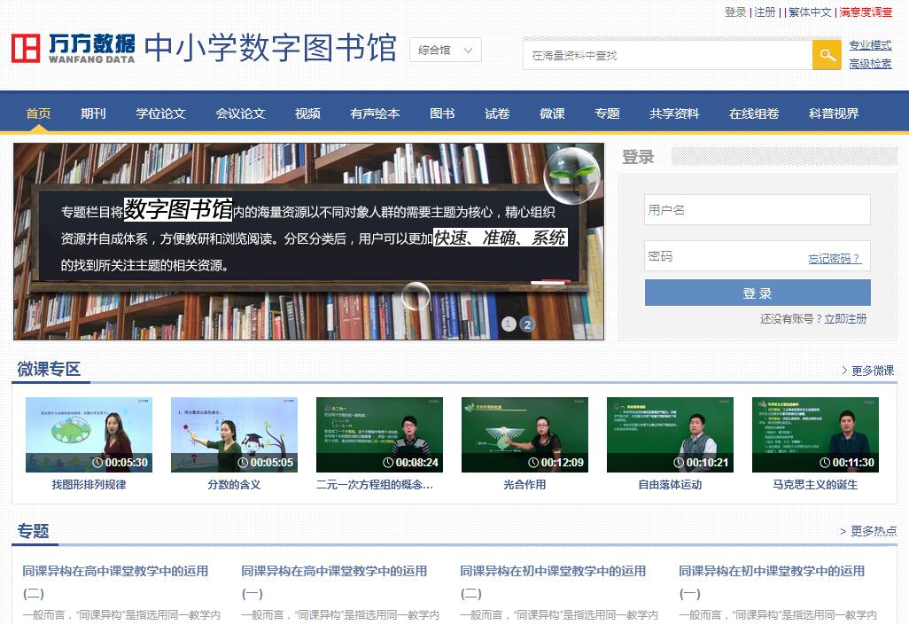 | 网站简介: 万方数据中小学数字图书馆。1993年,北京万方数据公司正式成立,是国内较早提供专业数据库服务的公司。1997年,万方数据(集团)公司成立,科技信息服务网站中国信息(Chinainfo)正式对外服务。2000年,国家科技部直属事业单位中国科学技术信息研究所联合其他4家单位发起组建了北京万方数据股份有限公司(以下简称“万方数据”)。10多年来,万方数据保持稳定快速的发展,已成为一家以提供信息资源产品为基础,同时集信息内容管理解决方案与知识服务为一体的综合信息内容服务提供商,形成了以“资源+软件+硬件+服务”为核心的业务模式。基础教育业务是万方数据战略发展重点之一,基础教育事业部全面负责公司基础教育产品的发展规划、产品开发,市场推广与客服支持工作,并负责指导、协调公司各销售大区基础教育产品的销售活动。我们的愿景:以技术创新为驱动,不断提供超越客户期望的产品和服务,做知识服务的领跑者。我们的使命:为人们获取知识、创造知识提供高标准的产品和服务;让知识的学习、发现、创造更加愉悦! |