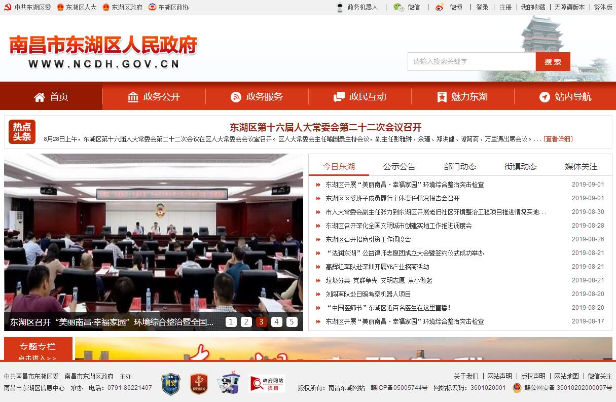 南昌市东湖区地处南昌市东北部,区域面积56.95平方千米,辖1个镇、9个街道办事处和2个管理处。2018年,全区总人口503610人,其中城镇常住人口501596人,人口城镇化率为99.60%,比上年末提高0.02个百分点。辖区拥有园林绿地面积479.93公顷,绿化覆盖面积472.06公顷,城区绿化覆盖率29.67%,人均公共绿地面积7.18平方米。2018年,东湖区全年实现地区生产总值513.05亿元,同比增长8.1%;500万元以上固定资产投资同比增长13%,增速位居全市前列;社会消费品零售总额318.79亿元,同比增长10.6%,其中,限额以上零售额总量位居全市首位;规上服务业营业收入40.76亿元,同比增长16.1%;完成财政总收入(省口径)77.0亿元,同比增长19.1%;地方一般公共预算收入13.2亿元,同口径增长4.7%;城镇居民人均可支配收入达42632元,同比增长8.1%,总量居省、市第一。税收收入占财政总收入比重和地方一般公共预算收入比重分别为97%和87%,财政收入质量明显提升。2018年,全年预计实现服务业增加值491.37亿元,同比增长8.7%,服务业对全区经济增长贡献率达到98.27%,拉动经济增长8.4个百分点。新增“六大产业”企业562户;新增规模以上服务业企业103户,省市服务业龙头企业10家,省市服务业集聚区3个,省市服务业品牌11个。盈科行网络、百盛中山城百货入闱“省级龙头企业”;豫章1号文化科技园蝉联全省文化产业“金杜鹃”奖,获评省级文化产业示范基地。年营收超100亿元的苏宁红孩子母婴用品全国销售结算中心和省级零售总部全面投入运营。海印餐饮、江西科诺荣膺 “江西省先进非公有制企业”,我区荣获“全省发展非公有制经济先进区”。2018年,全年实施60个总投资达466.96亿元的重大重点项目,项目的数量、体量、质量“三量”齐升,创历史新高。其中,16个产业项目开工率100%、年度计划投资完成率100%。新增注册企业1631户、注册(认缴)资本达75.57亿元;新增个体工商户3675户,同比增长1.4%,新增个体从业人员8283人。新增税收亿元楼宇1栋,千万元以上楼宇达15栋,楼宇总建筑面积、商务面积分别为59.3万和44.6万平方米,入驻目标楼宇企业2128家,产生税收约10.8亿元,目标楼宇贡献率同比提高9.6个百分点。在全省市县科学发展综合考评中,荣获一类县区第5名。2018年,全年预计实际利用外资2.8亿美元,同比增长25.9%;实际利用内资60亿元,同比增长20.45%;利用省外项目进资43.3亿元,同比增长20%;出口总额2.93亿美元。成功举办南昌苏宁广场暨2018年东湖区重大重点项目集中开工(签约)仪式,现场集中开工项目22个,总投资175.6亿元;集中签约项目15个,总投资135亿元。在世界VR产业大会等重大招商活动上,与启明星辰等知名企业签约项目17个。全年注册亿元以上项目24个,立项投资额110亿元,其中,10亿元以上项目6个,20亿元以上项目2个。投资85亿元的苏宁广场、投资35亿元的中海寰宇、投资20亿元的中金中心、投资20亿元的江旅都市方舟项目等具有引领性、引爆型产业项目建设顺利推进。2018年,统筹推进“拆、改、提、留”,让老房子、老街区重新焕发生机。实施轨道交通四号线下沙沟站、江西省中医院等13个地块、6.42万平方米、800余户的征迁任务;大力开展“净地行动”,青山北路综合管廊、下正街、上沙窝等地块近百个历史遗留问题得到了有效解决。在环湖路民德路地块(一期)征迁的基础上,投入7000万元,启动百花洲景区提升改造;完成滕王阁周边街区综合改造,助力滕王阁景区成功晋升国家5A级景区,全力打造老城区历史文化“样板”。完成中山路等景观亮化工程,全市首个湖面“水幕电影”惊艳八一公园,与全市“一江两岸”建筑外立面景观亮化提升改造相互映衬。深入开展“蓝天行动”,全面落实“四不开工、四不出门”、“八个100%”部署;推进“保护母亲河-赣江”行动,启动赣江(东湖段)沿线非法码头整治,完成赣江右岸八一桥至二七北路19个排污口截污工程;水环境治理由河长制向湖长制延伸,消灭了城区内的黑臭水体,以贤士湖为代表的水环境“中西医结合”治理实现了“水清、岸绿、景美”。2018年,全年用于保障和改善民生支出17.6亿元,同比增长10.7%,占地方一般公共预算支出的69%。新增就业人数10091人,“4050”人员再就业人数2096人,零就业家庭安置率100%。率先实施养老保险参保缴费“一站式”服务,参保人数达5.3万人,累计发放养老金5.9亿元。城镇基本医疗保险参保人数达19.11万人,征缴基金总额达1.76亿元。保障公共租赁住房4914户,为5937户无房户、困难户累计发放租赁补贴1891万元;为2680户4142人发放城市低保金2796.7万元。七里村、熊邓村、上沙窝、起凤路等旧城改造安置房建设全面推进。居家养老志愿服务“时间银行”逐步拓展,共建立“时间银行”分行12家、支行102家,打造了一批“智慧养老”“健康养老”典型,医养融合的经验在全省推广。2018年,“学在东湖”品牌持续唱响,投入1200万元实施“校安工程”,对育新学校、扬子洲学校等17所学校基础设施进行提升改造;认定4所民办幼儿园为普惠民办幼儿园,全区普惠性幼儿园达47家,滕王阁保育院荣获省级示范幼儿园称号;组建育新学校、豫章小学、邮政路小学三大教育集团,推动义务教育由“基本均衡”向“优质均衡”迈进;入选全省唯一“国家义务教育质量监测结果应用实验县区”;荣获全国第二届基础教育成果奖。为上营坊、青阳等42个社区新增、更换健身路径器材190余件;蝉