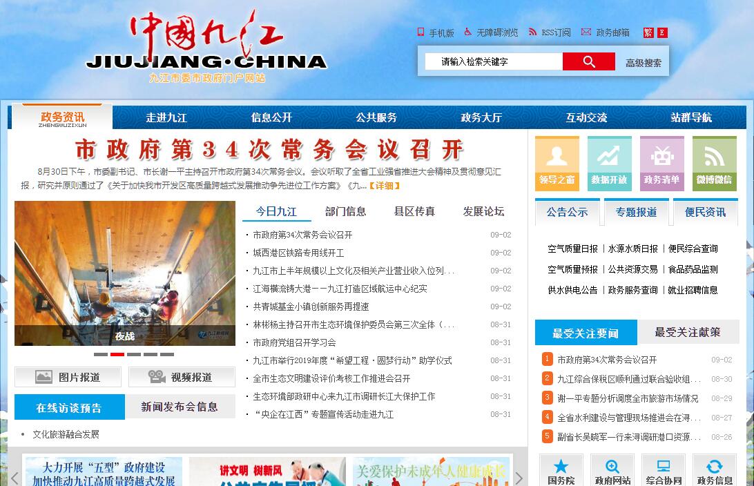 九江,简称 “浔”,古称浔阳、柴桑、江州,为江西省地级市,是一座有着2200多年历史的江南文化名城,历代为都、郡、州、府治地。九江位于江西省最北部,长江中下游南岸,鄱阳湖北畔,赣、鄂、皖、湘四省交界处,长江、鄱阳湖、京九铁路的三大交叉点,是东部沿海与中部内陆的过渡地带,也是江南的三大茶市与四大米市,号称“三江之口、七省通衢”与“天下眉目之地”,有“江西北大门”之称。九江是江西省区域中心城市之一、昌九一体化双核城市、环鄱阳湖城市群副中心城市、长江中游区域中心港口城市、赣鄂皖湘区域性现代化中心城市。九江是中国首批5个沿江对外开放城市之一、江西唯一的国际贸易口岸城市,九江港是长江流域十大港口之一,国家一类口岸。九江全境东西长270公里,南北宽140公里,总面积19078平方公里,占江西省总面积的11.3%,2017年年末,全市总人口为487.33万人。辖浔阳区、濂溪区、柴桑区、武宁县、修水县、永修县、德安县、都昌县、湖口县、彭泽县、瑞昌市,庐山市、九江经济技术开发区、共青城市、庐山风景名胜区管理局、庐山西海风景名胜区和八里湖新区。九江人文深厚、风景秀丽,素有“江派浔阳郡、分明似画图”之美称,有中国第一大淡水湖“鄱阳湖”;世界文化景观遗产、中华十大名山“庐山”;佛教净土宗发源地“东林寺”;中国四大书院之首“白鹿洞书院”等风景名胜古迹。九江曾获“ 中国优秀旅游城市、中国十大魅力城市、中国十佳宜居城市、国家园林城市、国家森林城市、全国双拥模范城市、全国无障碍建设先进城市、最具国际影响力旅游城市” 等称号。2018年,九江全市实现生产总值2700.19亿元,按可比价格计算,增长11.87%;增速全省第1位,总量排名全省第3位;完成财政总收入461.29亿元,增长11.1%;一般公共财政预算收入262.54亿元,增长0.8%;规模以上工业增加值1204.93亿元,增长9.2%;固定资产投资2730.96亿元、增长12.5%,其中工业固定资产投资2134.16亿元、增长14.5%;社会消费品零售总额739.21亿元,增长12.6%;实际利用外资19.84亿美元,同比增长10.1%;出口总值289.1亿元,增长2.3%;金融机构人民币存款余额2916.18亿元,增长12.4%;金融机构人民币贷款余额2073.51亿元,增长18.2%;城镇居民人均可支配收入34592元,增长8.6%;农村居民人均可支配收入23303元,增长9.4%。2019年7月5日,中华人民共和国生态环境部公布了2019年统筹强化监督(第一阶段)黑臭水体专项排查情况,九江被列入“黑臭水体消除比例低于80%的城市名单”,消除比例为0%。2019年7月,被评为国家知识产权试点城市。