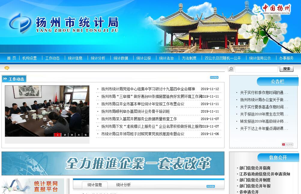 扬州市统计局,为市政府工作部门,正处级建制。其主要职责是:(一)依照国家法律、法规拟订全市统计工作规划,组织指导和综合协调全市统计和国民经济核算工作。(二)依照国家的国民经济核算体系和统计指标体系,制定全市统一的基本统计报表制度及部门统计标准。(三)负责汇集、核定、管理、公布全市基本统计资料,定期发布全市国民经济和社会发展情况的综合报表和统计公报;对国民经济、社会发展、科技进步和资源环境情况进行统计分析、统计预测和统计监督,向市委、市政府及有关部门提供统计信息和咨询建议。(四)会同有关部门组织实施各项普查和重点抽样调查及重大的市情市力调查;汇总、整理和提供有关市情市力方面的统计数据。(五)贯彻执行国家统计报表制度,按照统一标准及口径,完成各项统计调查任务和定报、季报、年报等统计报表上报任务。(六)负责统计法律法规的宣传工作,指导和规范全市统计行政执法工作,监督检查统计法律法规的贯彻落实情况;组织实施对县(市、区)政府以及市级部门、单位的统计督查和对统计调查对象的统计监审,依法查处重大统计违法行为。(七)组织实施全面小康监测、科学发展评价考核监测统计方面的工作。(八)建立健全和管理全市统计信息自动化系统及统计数据库,组织制定县(市、区)及市各相关部门统计数据库和网络的基本标准及运行规则,指导全市统计信息化系统建设。(九)负责全市统计干部教育和专业培训,会同有关部门组织管理全市统计专业资格考试、专业技术职务评聘和从业资格认定工作。(十)承办市委、市政府交办的其他事项。