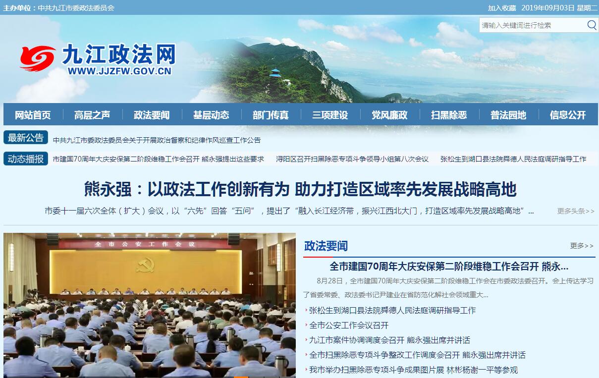 九江市委政法委员会是市委领导和管理全市政法工作的职能部门,从宏观上组织领导全市政法各部门的工作,指导各县(市、区)委政法委的工作。其主要职责是:(1)贯彻执行中央、省委和市委、市政府有关政法工作的方针、政策和工作部署,统一政法各部门的思想和行动。(2)组织推动依法治市方略的实施,调查研究实施中存在的问题,向市委提出建议。(3)根据中央、省委和市委、市政府总体要求,对一定时期内的政法工作作出全局性部署,并督促贯彻落实。(4)组织、协调、指导维护社会稳定的工作。(5)组织、协调社会治安综合治理工作,推动各项措施的落实。(6)检查政法部门执行法律法规和党的方针政策的情况,结合我市实际,研究制定严肃执法、落实党的方针政策的具体措施。(7)大力支持和严格监督政法各部门依法行使职权,指导和协调政法各部门各负其责、密切配合、相互制约,督促、推动大案要案的查处工作,研究、协调有争议的重大、疑难案件。(8)针对新时期政法工作出现的新情况、新问题,组织推动政法战线的调查研究工作,提出解决问题的对策。(9)协调、推动政法工作改革,通过改革进一步加强政法工作。(10)加强政法干部队伍建设和政法各部门领导班子建设,协助党委及其组织部门考察、管理政法部门的领导干部。(11)指导下级政法委员会和社会治安综合治理委员会的工作。(12)承办市委、市政府交办的其他事项。