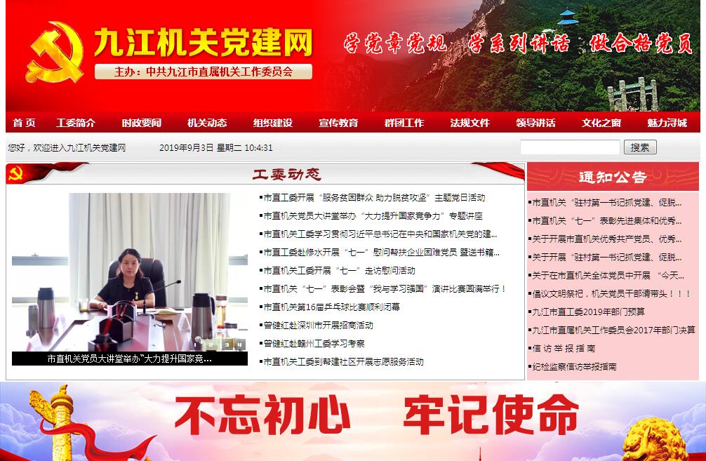 | 网站简介: 九江市直机关工委是中共九江市委派出的职能机构。负责领导市直机关单位(含部分中央,省驻浔单位)党的工作。其主要职能是:抓好市直机关党的思想建设、组织建设、作风建设;加强对市直部门领导班子的民主生活会的管理,对党员领导干部的监督,并及时向市委反映情况;指导市直机关党组织加强社会道德建设,文明建设,法制宣传教育和社会稳定工作;负责市直各部门机关党组织和机关纪委领导班子组成人员的审批,及机关党组织专职副书记的任免、考核、培训工作和基层党组织变更、调正、换届的审批;领导市直各部门机关党的纪律检查工作,审理、批准科级党员干部及党组织违反党纪的处理决定;领导市直机关工、青、妇等群众组织的工作;指导全市各县 (市、区、山)工委工作;承办市委交办的各项中心工作。中共九江市直机关工委现管辖142个直属机关党组织,管理党员3.5万名。现有12个工作部门,其中内设办公室、组织部、宣传部、普法办、机关党总支、610办、调研室、党建信息科及党员教育培训科等9个部门,另有工会工委、团工委、妇工委3个派出机构。 |