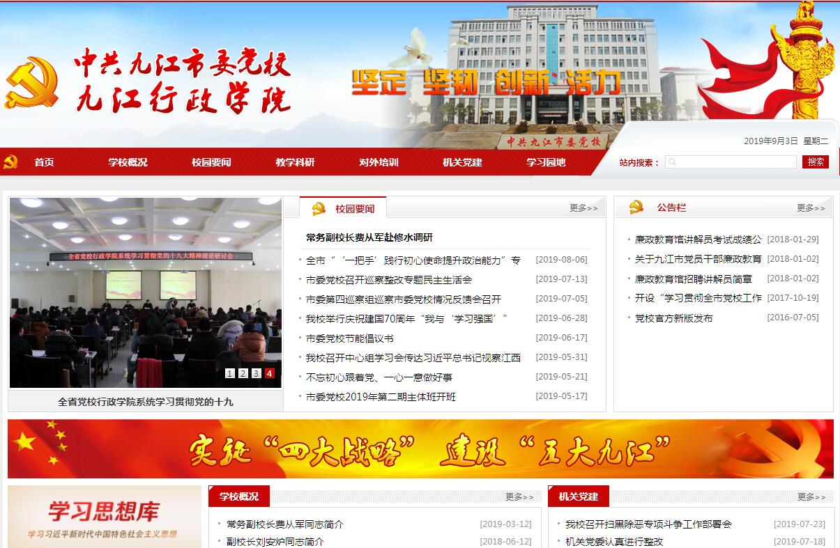 中共九江市委党校兼九江行政学院、九江社会主义学院于一身,是九江市培养各级党政干部的摇篮。九江市委党校位于九江市西侧后纬路4号,面临滚滚长江,背依巍巍庐山,东连碧波荡漾的甘棠湖,西接日新月异的开发区,交通便利,环境幽静。现有教职员工80人,年训干规模450人。九江市委党校按照“实事求是、与时俱进、艰苦奋斗、执政为民”的办学要求,坚持“党校姓党”的原则和“从严治校、从严管理、从严施教”的治校方针,发扬“忠诚、守纪、求实、创新”的校风,不断深化各项改革,办校条件、办公条件、学员生活条件、校园环境不断改善,教学水平、科研水平、管理水平、职工生活水平不断提高。目前,九江市委党校已经建立了一支政治强、业务精、作风正、结构合理的教师队伍,教学水平稳步提高,理论研究成果丰硕,管理水平不断提升,教学设施逐年完善,校园环境日益美化。现有教授、副教授二十余名,校内树木葱茏,绿草如茵,鸟语花香。九江市委党校正努力朝着“教学质量一流、教学条件一流、管理水平一流”的方向迈进!九江市委党校占地面积32亩,总建筑面积4.3万平方米,有功能齐全的报告厅、多媒体教室,有设备一流的微机室,拥有各类图书资料7万多册,各类报刊杂志150余种,有可供数百人同时用膳的餐厅,有可供260人同时入住的标准间学员宾馆。