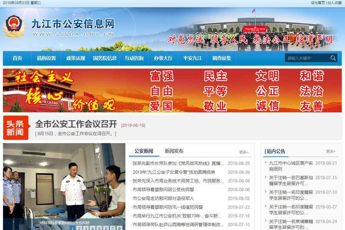 九江市公安局,是九江市人民政府下设主管九江市全市公安工作的职能部门,归公安部、九江市人民政府双重领导。九江市公安局成立于1949年6月2日。经过60多年不断发展壮大,目前已拥有特警、巡警、交警、水警及户籍、民航等10余个警种,市局内设治安、刑侦等26个部门,直属浔阳区、濂溪区公安(分)局等17个单位,下辖17个县(区、市)公安局,全市167个派出所,总警力5200余人。根据《中共九江市委九江市人民政府关于印发〈九江市人民政府机构改革实施方案〉的通知》(九字〔2010〕16号),保留九江市公安局,为九江市人民政府工作部门。其主要职责是:(一)贯彻执行国家的法律、法规和公安工作的方针、政策。拟订全市公安工作的规定和实施办法,对全市公安机关实施组织领导和指挥,部署、指导、监督和检查全市公安工作。(二)掌握影响社会稳定、危害国内安全和社会治安的情况,为市委、市政府和省公安厅提供社会治安方面的重要信息并提出相应决策。(三)组织实施并指导全市公安机关侦查工作。组织、协调处置重大案件、治安事件、治安事故和重大群体性事件、骚乱。(四)组织实施并指导全市公安机关依法查处违反治安管理行为,依法开展治安行政管理工作,指导、监督全市公安机关治安保卫工作。(五)组织指导出入境和外国人在我市辖区内居留、旅行的有关管理工作,组织指导全市公安外事工作。(六)组织实施并指导、监督全市消防、警卫工作,对武警部队执行公安任务及相关业务建设实施领导和指挥。(七)组织实施并指导全市公安机关维护道路交通安全、交通秩序以及机动车辆、驾驶人管理工作,查处交通事故。(八)组织实施并指导、监督全市公安信息网络安全保护工作,负责信息安全等级保护工作的指导、检查、监督。组织实施并指导、监督全市公共信息网络安全监察和涉网案件的侦破工作。(九)指导、监督全市公安机关依法承担的执行刑罚工作,组织实施并指导、监督全市看守所、拘留所、强制隔离戒毒所、戒毒康复中心等管理工作,规划和指导全市监所建设。(十)组织实施并指导全市公安法制建设,指导、检查、监督全市公安机关执法活动,负责劳动教养对象的审批和有关劳教对象申诉案件的管理工作。(十一)组织实施并指导全市公安机关开展禁毒和缉毒工作,组织实施并指导全市公安机关戒毒康复和禁毒教育基地建设,承担市禁毒委员会办公室的日常工作。(十二)组织、指导、协调对全市恐怖活动的防范、侦查、处置工作,承办市反恐怖工作协调小组办公室和处置劫机事件应急指挥部办公室的日常工作。(十三)组织实施并指导全市水上治安管理工作,拟订水上治安管理办法,会同有关部门处置跨地域的水上重大刑事、治安案件,维护水上治安秩序。(十四)组织实施并指导市区公共交通行业的治安管理,负责在市区内公交客运车辆及客运站区(点)发生的刑事和治安案件的侦破处理,维护公共交通秩序。(十五)组织实施民用航空安全管理工作,维护机场治安秩序,打击防范劫机、影响航空安全及破坏机场设施等违法犯罪。(十六)组织实施全市公安信息、通信、科学技术工作,规划公安指挥系统、信息技术、刑事技术和技术侦察建设。(十七)拟订并组织落实全市公安被装、装备、经费的配备标准和制度。(十八)组织实施、指导、协调全市公安机关处置暴力恐怖犯罪、严重暴力性犯罪,处置大规模流氓滋扰等重大治安事件,处置对抗性强的群体性事件,担负重大活动的安全保卫任务,担负特定的巡逻执勤任务。(十九)指导全市公安政治工作和队伍建设。组织实施并指导、管理全市公安宣传、教育训练工作,按规定权限管理干部人事工作。(二十)制定全市公安队伍监督管理工作规章制度,分析队伍状况,组织实施并指导全市公安机关督察工作,按规定权限实施对干部的监督,查处或督办公安队伍重大和较大违纪案件,指导全市公安队伍思想作风、工作作风建设。(二十一)组织实施并指导全市公安审计工作。(二十二)组织实施并指导全市公安档案管理工作。(二十三)市森林公安机关受主管部门和市公安局双重领导,公安业务工作以市公安局领导为主。(二十四)承办市委、市政府和省公安厅交办的其他工作。
