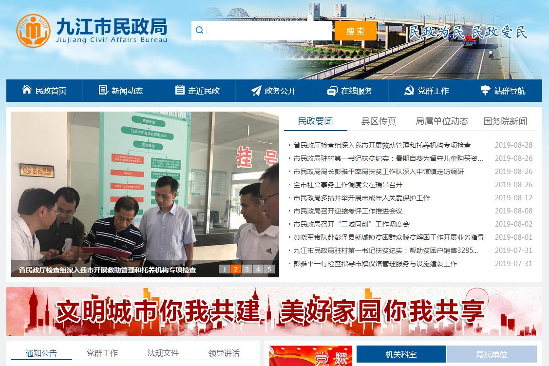 九江市民政局主要职责:(一)在全市经济社会发展总体规划的框架内,拟订全市民政事业发展规划和政策,草拟有关地方规范性文件,并组织实施和监督检查。(二)承担依法对社会团体、基金会、民办非企业单位进行登记管理和监察责任。(三)拟订全市优抚政策,申报褒扬烈士,负责伤残的退役军人残级评定和伤残器械的配置,指导参战参试人员身份认定工作,组织和指导拥军优属工作,承担九江市拥军优属拥政爱民工作领导小组的有关具体工作。(四)会同有关部门拟订全市退役士兵、复员干部安置政策和计划并组织实施,指导军供站正规化建设和管理。(五)按规定做好全市军队离休退休干部、军队无军籍退休退职职工的接收安置和服务管理工作。(六)拟订全市救灾工作政策,负责组织、协调救灾工作,组织自然灾害救助应急体系建设,负责灾情的核查、统计、上报和发布工作,管理、分配救灾款物并监督使用,组织、指导救灾捐赠,承担九江市减灾委员会的具体工作。(七)牵头拟订全市社会救助规划、政策和标准,健全城乡社会救助体系,组织实施农村困难群众住房救助,负责城乡居民最低生活保障、医疗救助、临时救助、生活无着人员救助工作,负责城市低收入家庭收入核定的管理工作。(八)拟订全市城乡基层群众自治建设和社区建设政策,指导社区服务体系建设,提出加强和改进城乡基层政权建设的建议,推动基层民主政治建设。(九)拟订全市行政区划管理政策和行政区域界线、地名管理办法,负责设区市、县(市、区)、乡(镇、街道)行政区域的设立、命名、变更和政府驻地迁移的申报工作,组织实施乡(镇、街道)级行政区域界线的勘定和管理工作,负责重要自然地理实体命名、更名的申报。(十)拟订全市社会福利事业发展规划、政策和社会福利机构管理办法;组织拟订促进慈善事业的政策,组织、指导社会捐助工作;指导老年人、孤儿和残疾人等特殊群体权益保障工作。(十一)拟订全市婚姻管理、儿童收养和殡葬管理政策,负责推进婚俗和殡葬改革,指导婚姻、收养、殡葬、救助服务机构管理工作。(十二)会同有关部门按规定拟订全市社会工作发展规划、政策和职业规范,推进社会工作人才队伍建设和相关志愿者队伍建设。(十三)承办市人民政府交办的其他事项。
